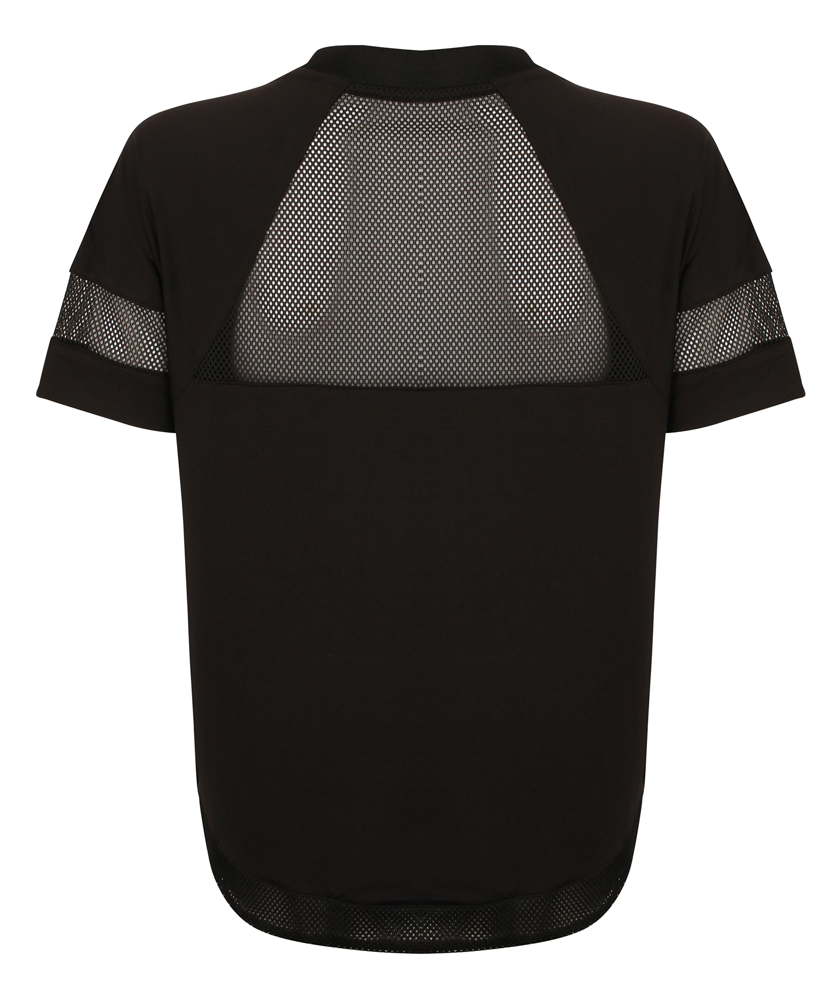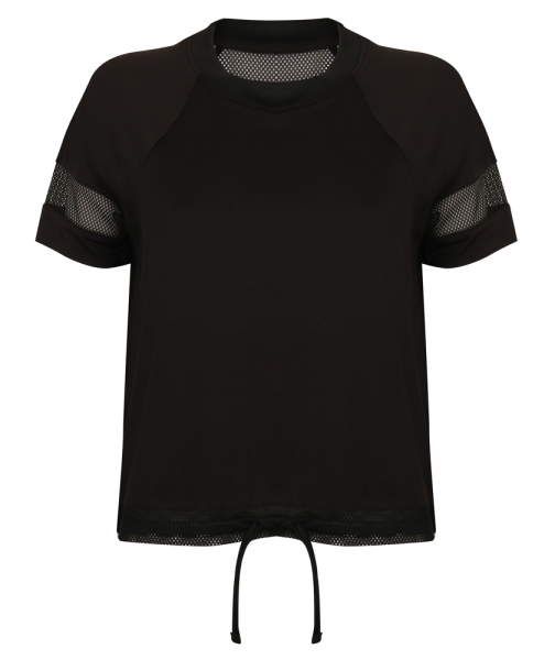 90% poliestere / 10% elastan. T-shirt sportiva da donna con orlo con cordino, per un'aderenza personalizzata. Dettagli in mesh su schiena e maniche, collo a costine e maniche raglan per una traspirabilità e una libertà di movimento maggiori.