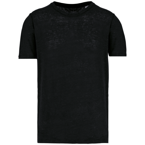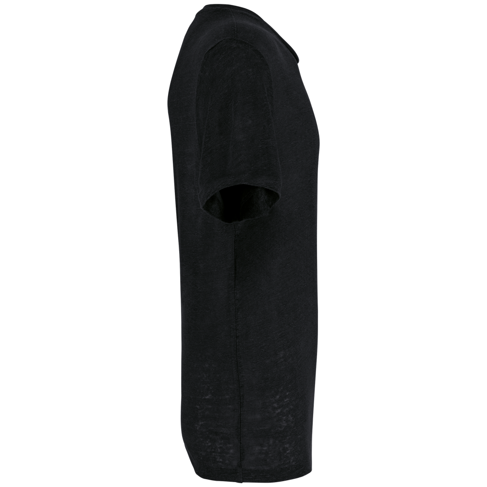 100% lino.Maglia. Taglio dritto. Cuciture laterali. Collo nel tessuto principale. Nastrino di rinforzo nel tessuto principale all’interno del collo. Finitura a doppia impuntura a fondo manica e fondo capo.
