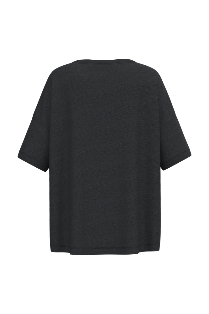 100% cotone biologico. Cotone pettinato. Maglia jersey aspetto fiammato. Taglio oversize con spalle spioventi. Lavaggio agli enzimi. Cuciture laterali. Collo tondo a costine 1 x 1. Rinforzi sulle spalle. Finitura all'interno del collo con nastrino di rinforzo nel tessuto principale tono su tono. Finitura a doppia impuntura a fondo manica e fondo capo.