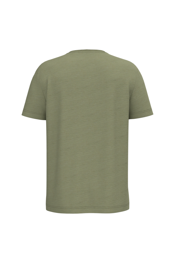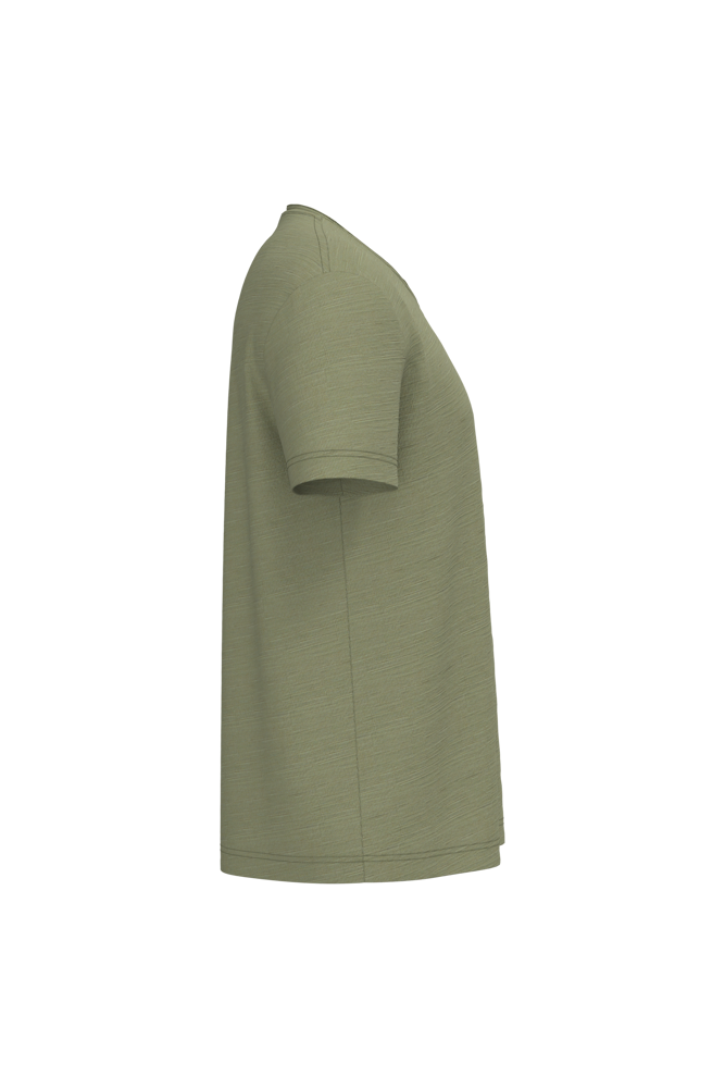 100% cotone biologico. Cotone pettinato. Maglia jersey aspetto fiammato. Taglio regolare con spalle spioventi. Lavaggio agli enzimi. Cuciture laterali. Scollo a V con bordi a taglio vivo nel tessuto principale. Rinforzi sulle spalle. Finitura all'interno del collo con nastrino di rinforzo nel tessuto principale tono su tono. Fondo manica e fondo capo con finitura a doppia impuntura.