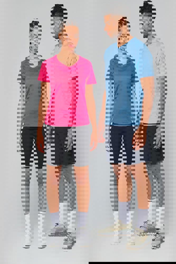 100% poliestere. Tessuto ad asciugatura rapida. Scollo a V con nastrino di rinforzo. Manica raglan con punti di copertura. Finitura a doppio ago a fondo manica e fondo capo.