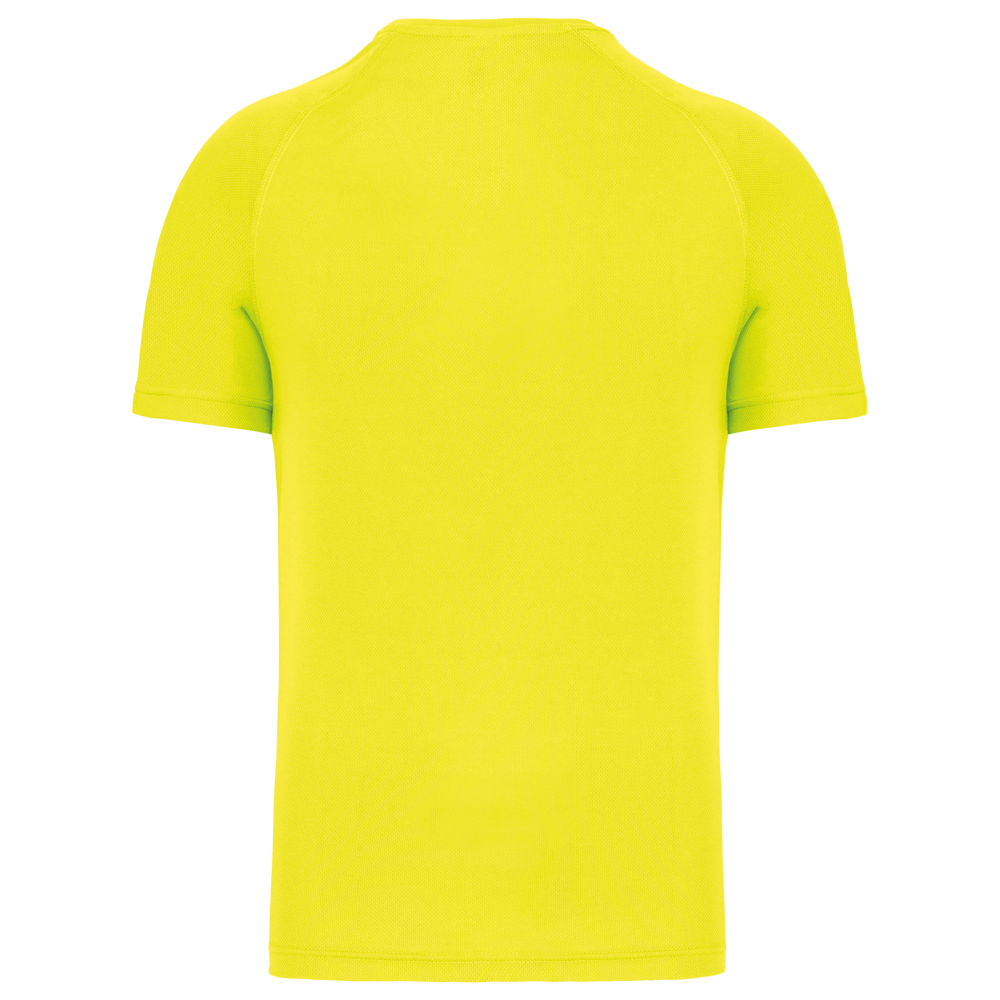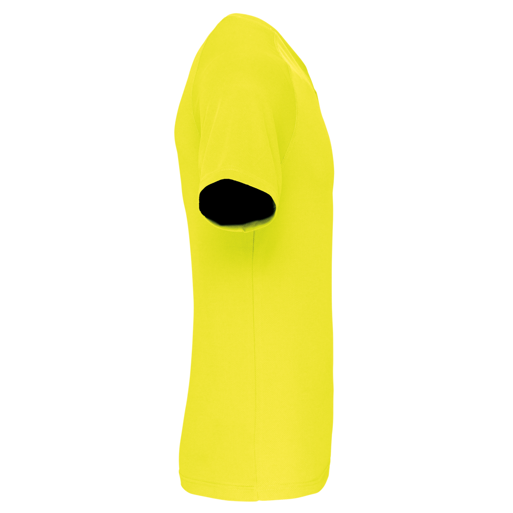 100% poliestere. Tessuto ad asciugatura rapida. Scollo a V con nastrino di rinforzo. Manica raglan con punti di copertura. Finitura a doppio ago a fondo manica e fondo capo.