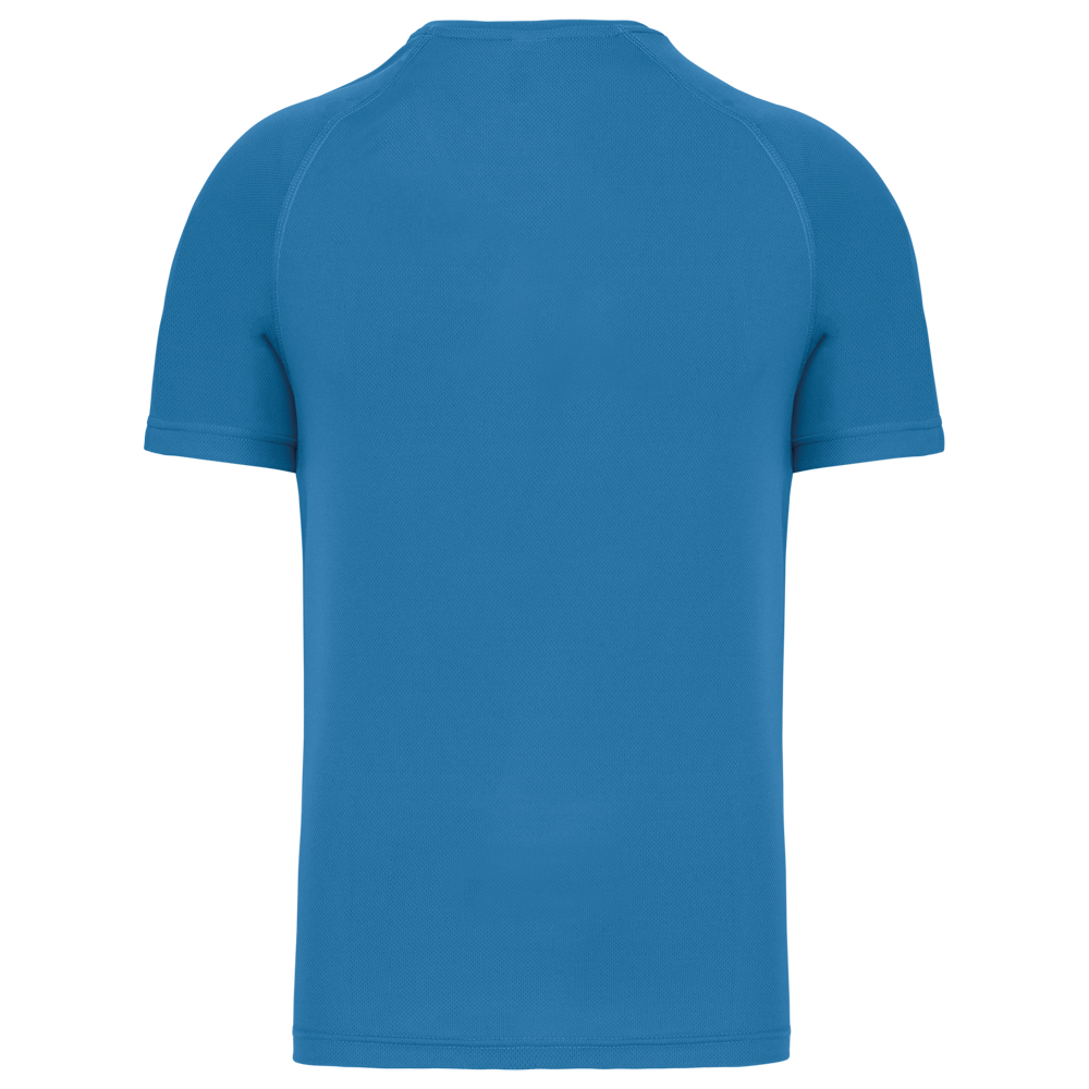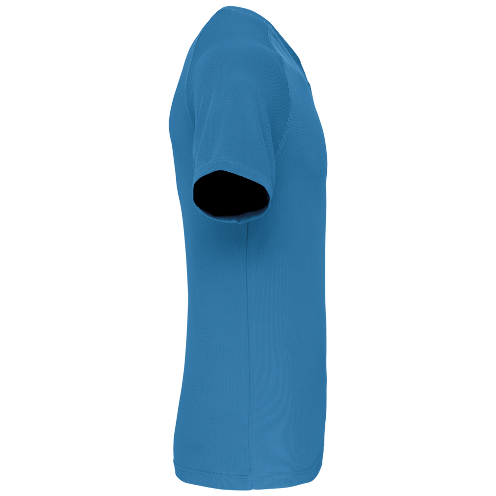 100% poliestere. Tessuto ad asciugatura rapida. Scollo a V con nastrino di rinforzo. Manica raglan con punti di copertura. Finitura a doppio ago a fondo manica e fondo capo.