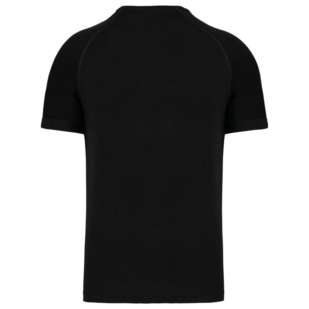 100% poliestere. Tessuto ad asciugatura rapida. Scollo a V con nastrino di rinforzo. Manica raglan con punti di copertura. Finitura a doppio ago a fondo manica e fondo capo.