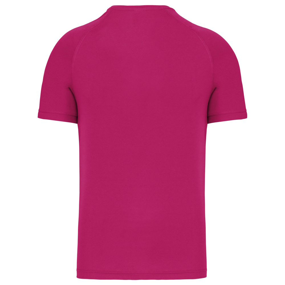 100% poliestere. Tessuto ad asciugatura rapida. Scollo a V con nastrino di rinforzo. Manica raglan con punti di copertura. Finitura a doppio ago a fondo manica e fondo capo.