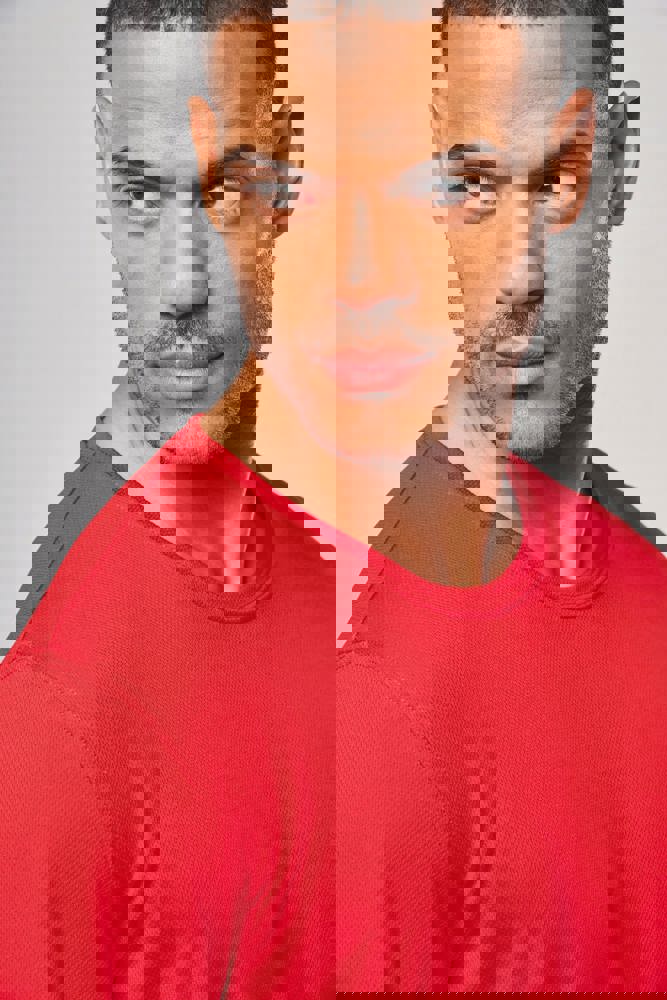 100% Poliestere. Tessuto leggero ad asciugatura rapida. Bordino al collo e al giromanica. Cuciture a doppio ago al collo, al giromanica e sul fondo. Nastrino di rinforzo al collo.