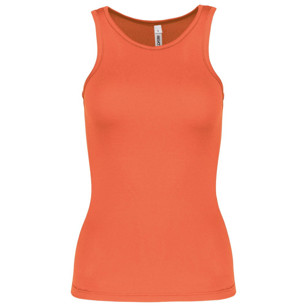100% Poliestere. Tessuto leggero ad asciugatura rapida. Bretelle all'americana. Bordino al collo e al giromanica. Cuciture a doppio ago.