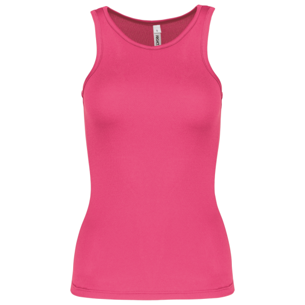 100% Poliestere. Tessuto leggero ad asciugatura rapida. Bretelle all'americana. Bordino al collo e al giromanica. Cuciture a doppio ago.