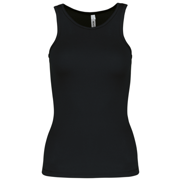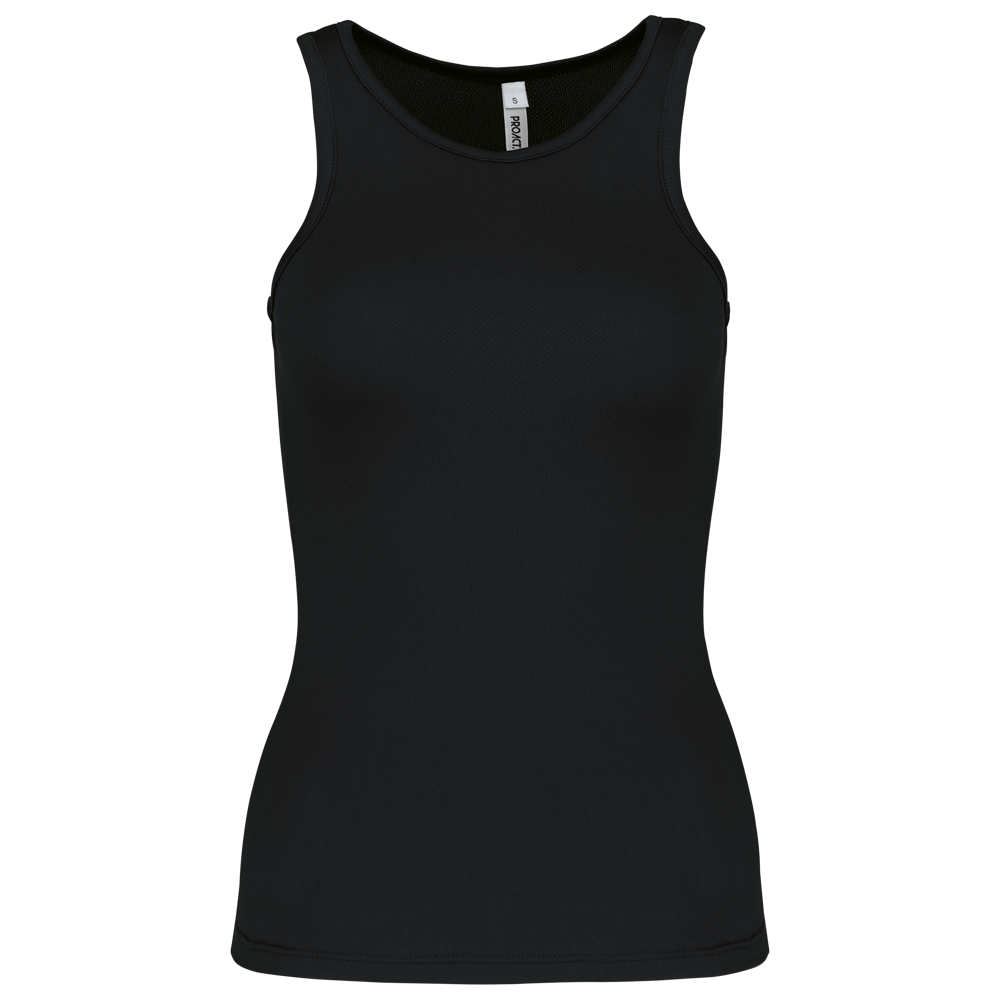 100% Poliestere. Tessuto leggero ad asciugatura rapida. Bretelle all'americana. Bordino al collo e al giromanica. Cuciture a doppio ago.