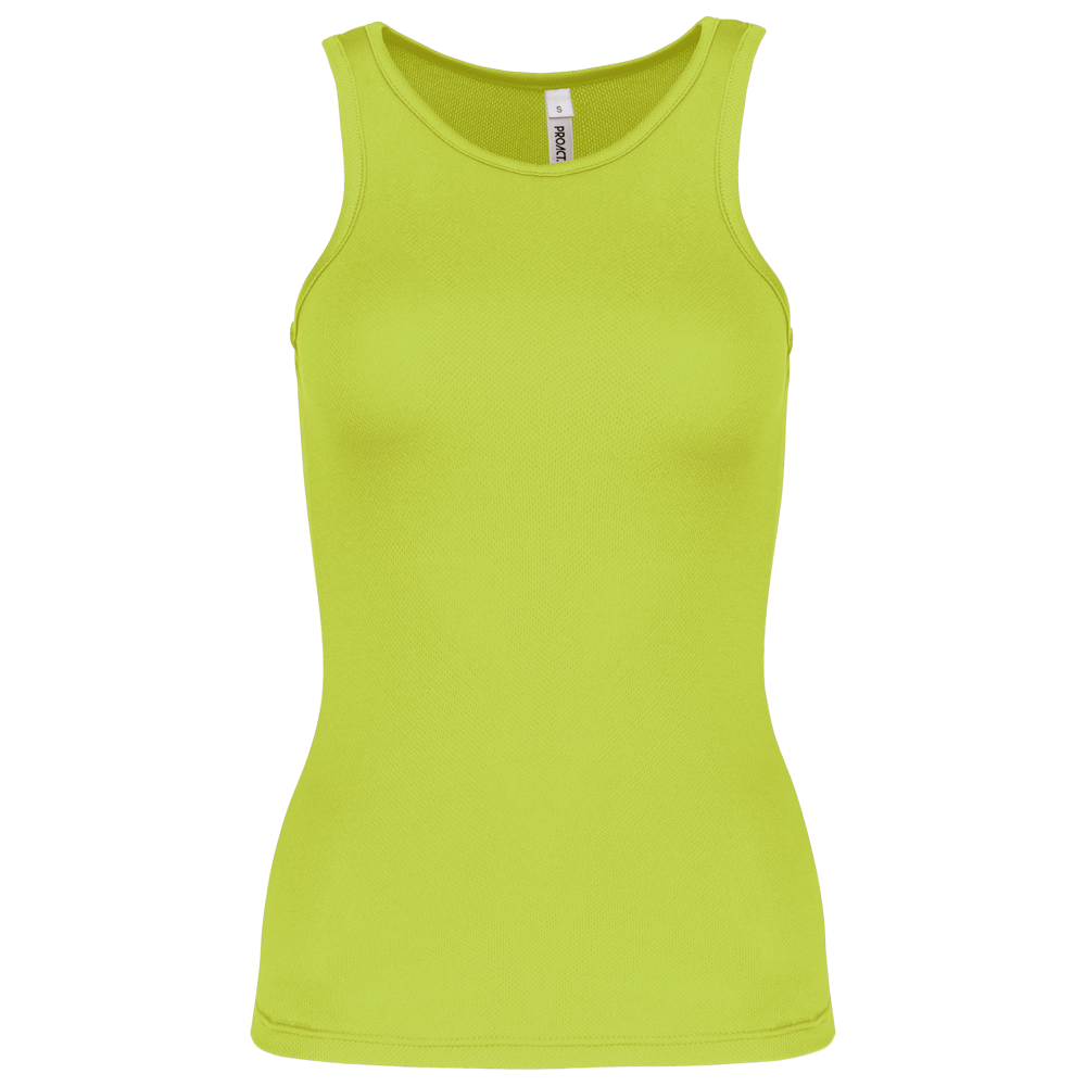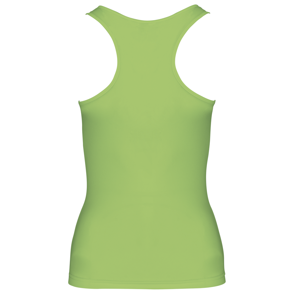 100% Poliestere. Tessuto leggero ad asciugatura rapida. Bretelle all'americana. Bordino al collo e al giromanica. Cuciture a doppio ago.