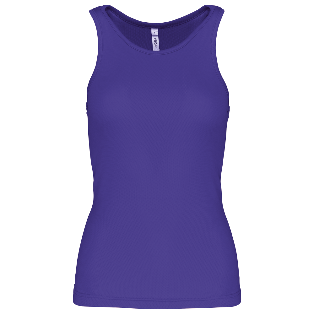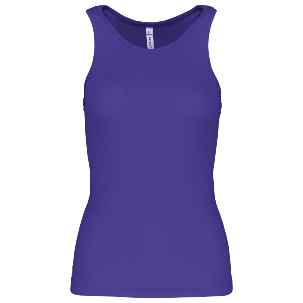 100% Poliestere. Tessuto leggero ad asciugatura rapida. Bretelle all'americana. Bordino al collo e al giromanica. Cuciture a doppio ago.