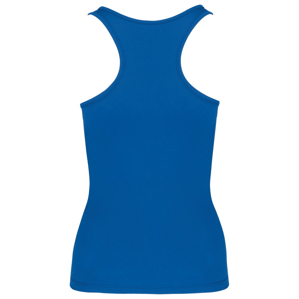 100% Poliestere. Tessuto leggero ad asciugatura rapida. Bretelle all'americana. Bordino al collo e al giromanica. Cuciture a doppio ago.
