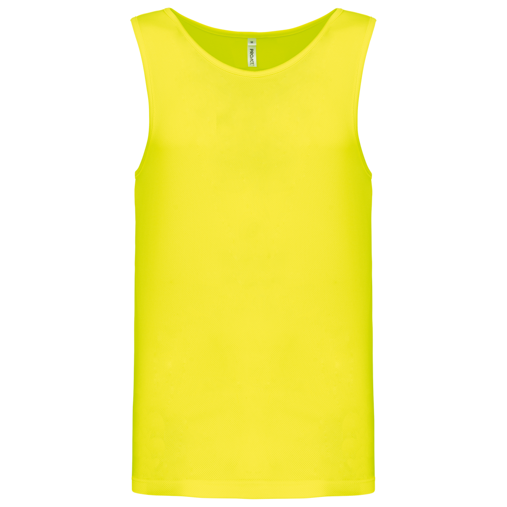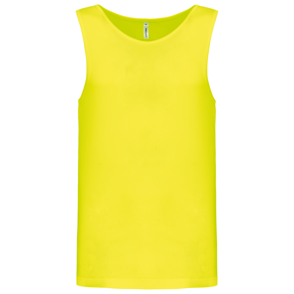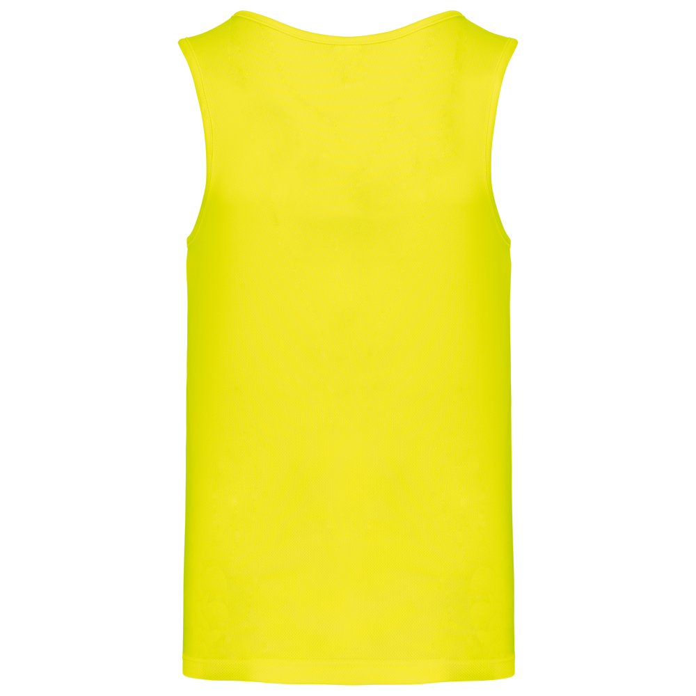 100% Poliestere. Tessuto leggero ad asciugatura rapida. Bretelle all'americana. Bordino al collo e al giromanica. Cuciture a doppio ago.