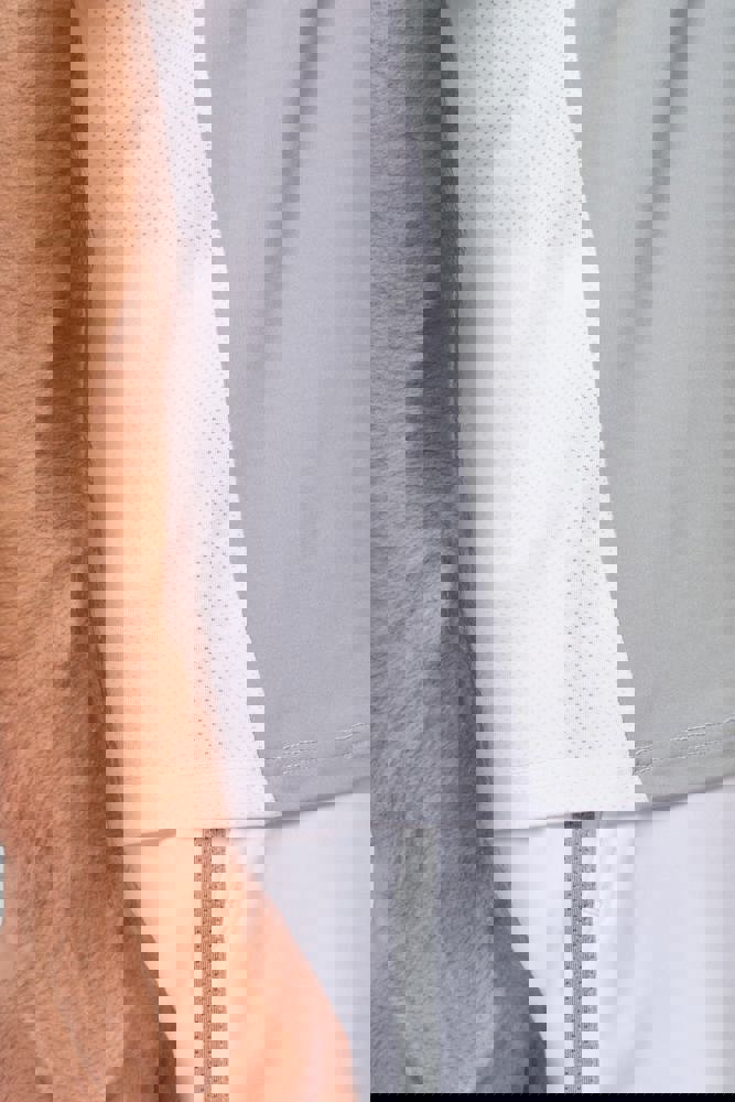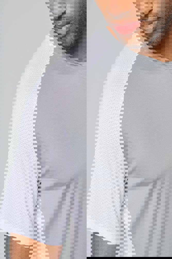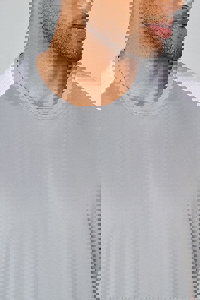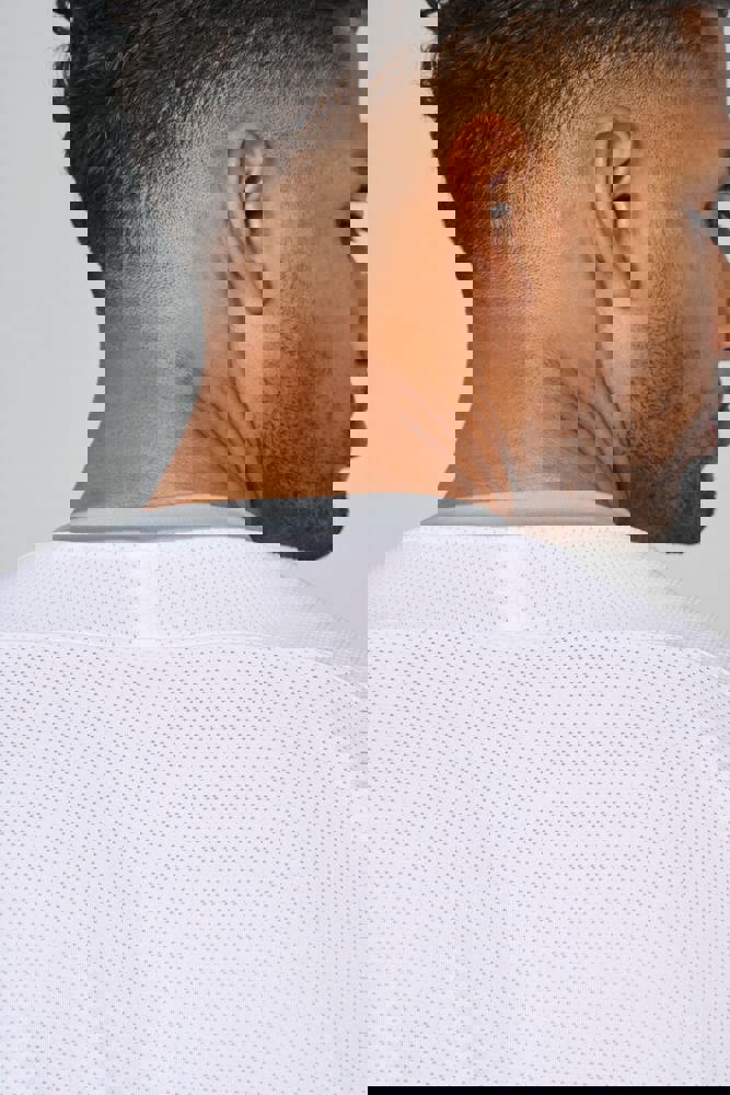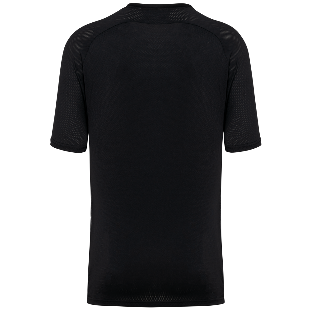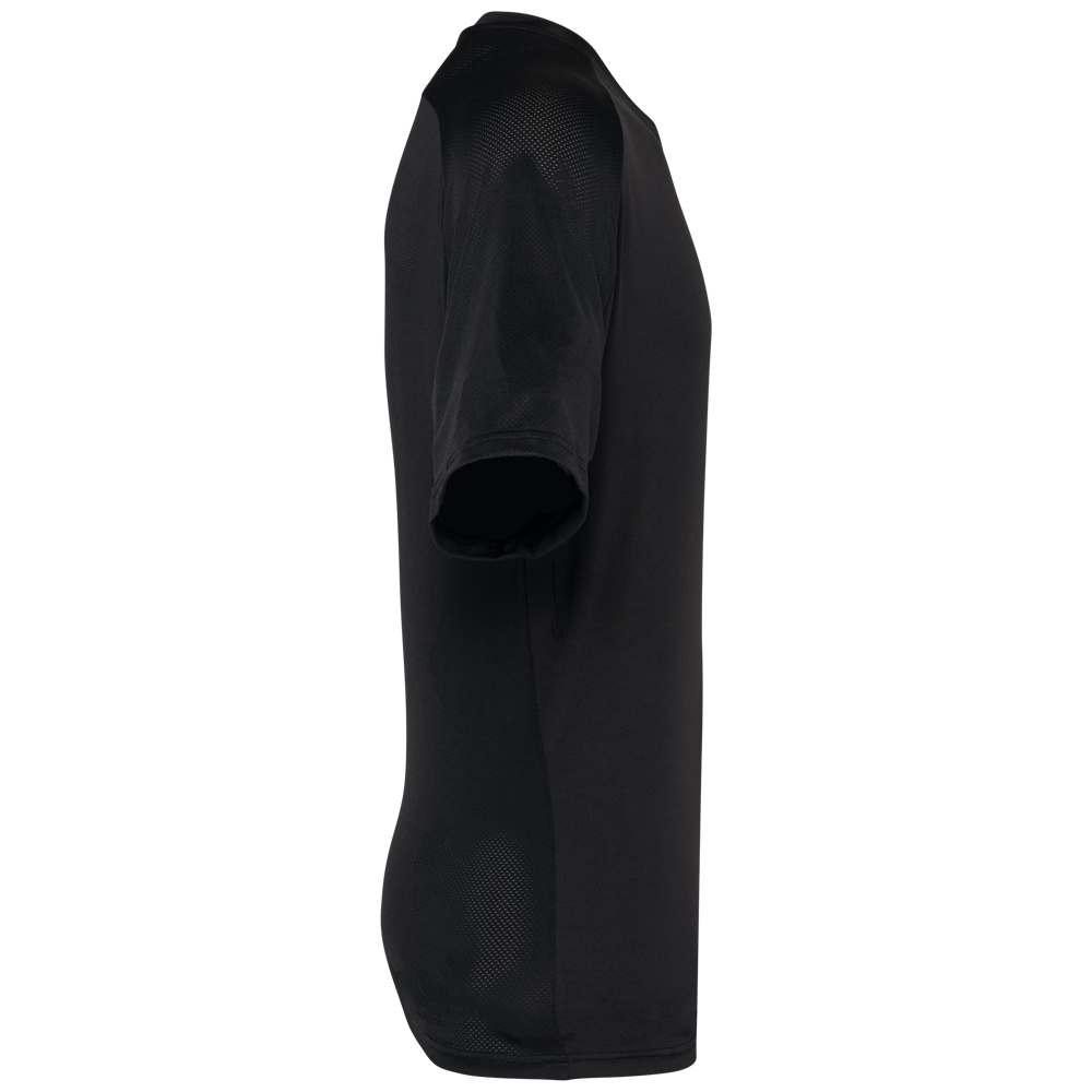 90% poliestere / 10% elastan. Parte birdseye: 92% poliestere / 8% elastan. Pannelli a contrasto in maglia "birdseye". Taglio dritto. Maniche raglan. Collo tondo in maglia jersey con struttura a inserto tono su tono sul davanti. Nastrino di rinforzo in jersey tono su tono. Pannelli a contrasto (o uniti per il colore Black) in maglia birdseye su fianchi, maniche e retro. Finitura a doppia impuntura a fondo manica e fondo capo. Etichetta con il nome della marca Tear-away.