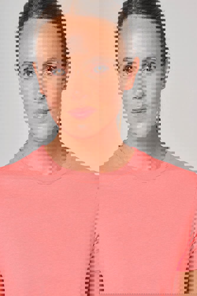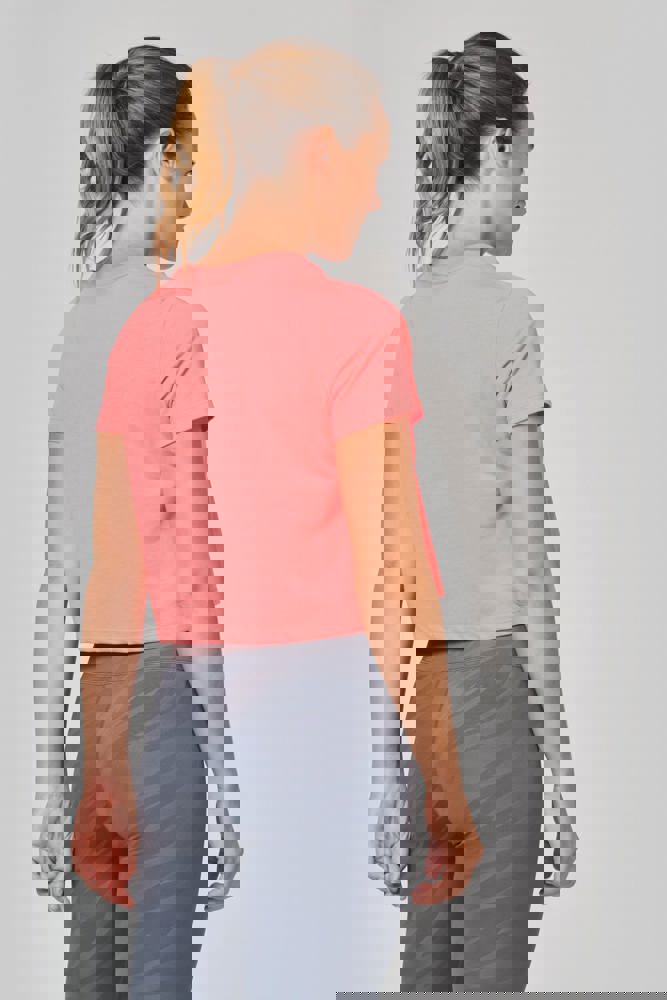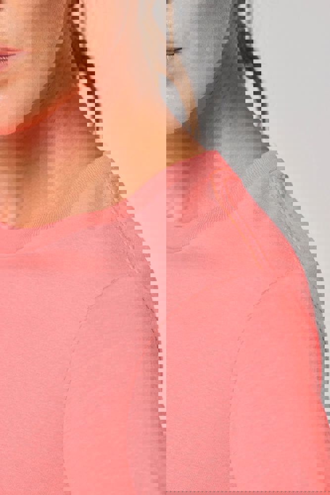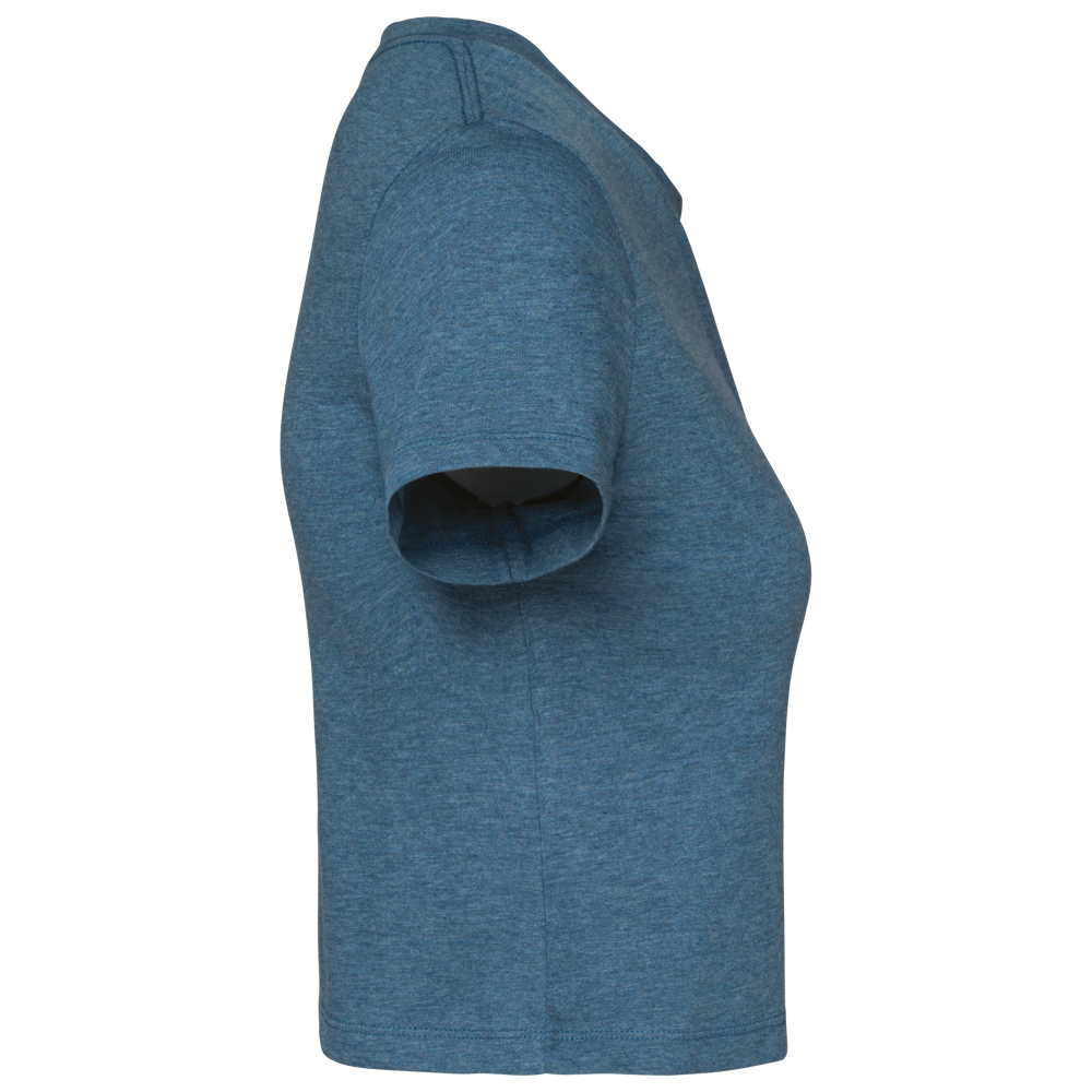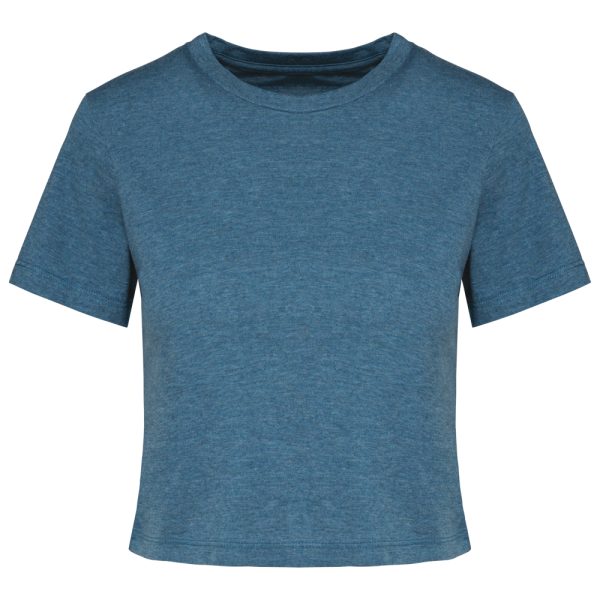 50% poliestere / 25% cotone / 25% viscosa. Tessuto jersey. Trattamento antipilling. Collo rotondo. Taglio dritto. Crop top. Nastrino di rinforzo tono su tono sul collo. Finitura a doppia impuntura a fondo manica e fondo capo. Finitura tubolare a fondo manica. Nessuna etichetta con il nome della marca; solo una piccola etichetta con l'indicazione della taglia per semplificare la personalizzazione.
