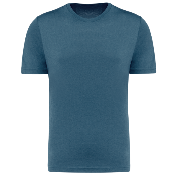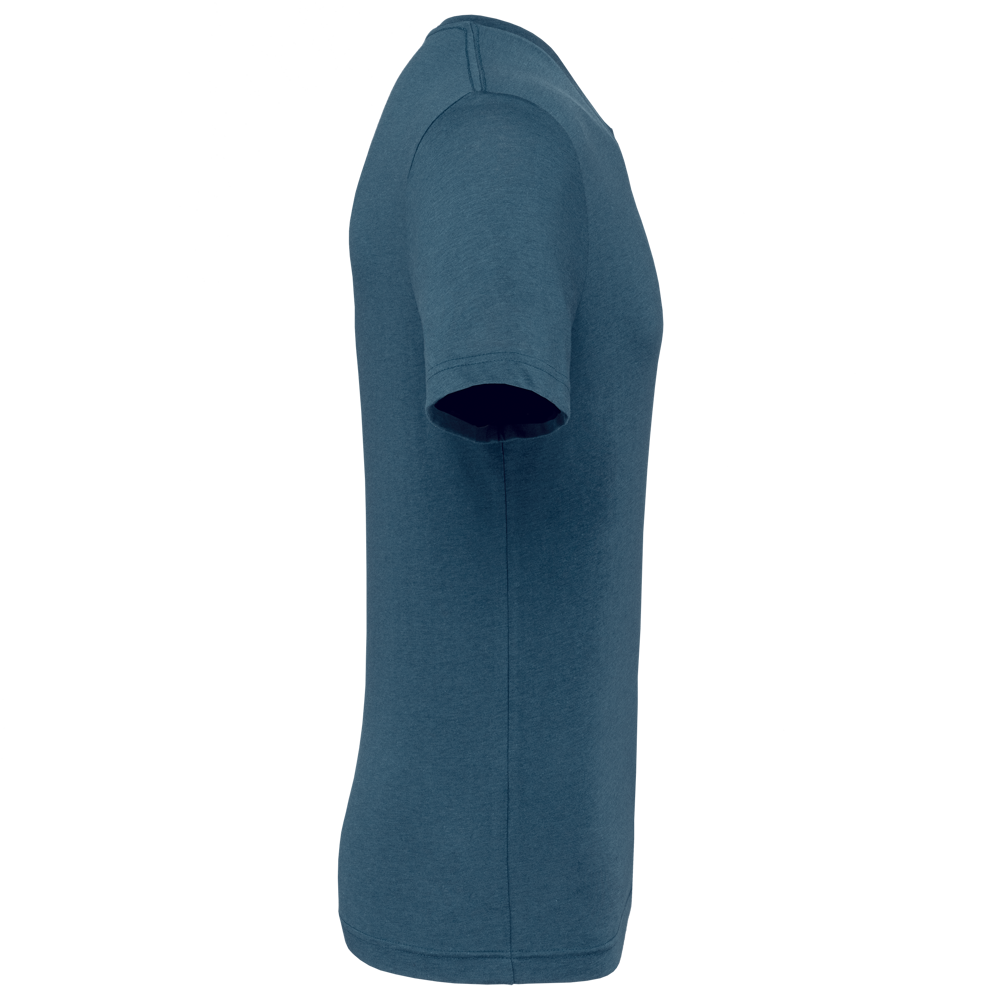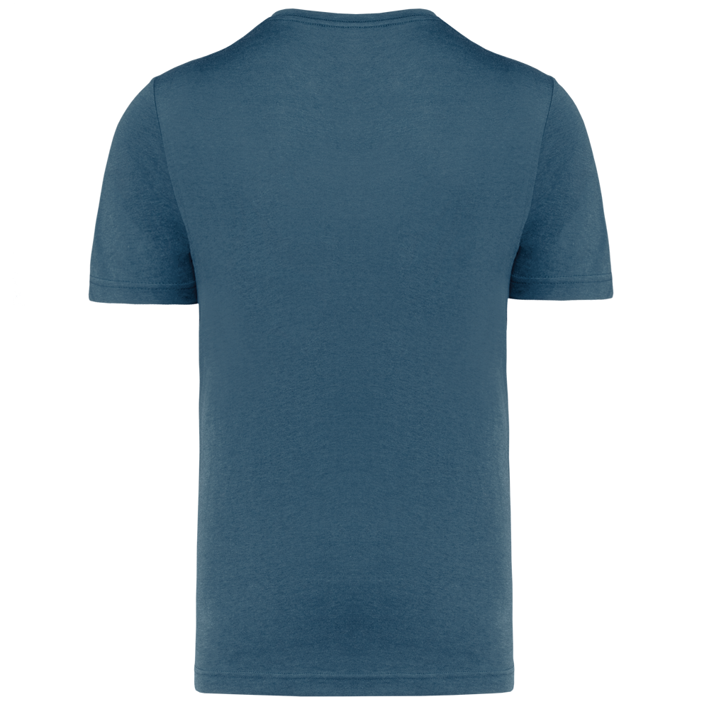 50% poliestere / 25% cotone / 25% viscosa. Tessuto jersey. Nastrino di rinforzo tono su tono sul collo. Finitura a doppia impuntura a fondo manica e fondo capo. Nessuna etichetta con il nome della marca al collo ma solo una piccola etichetta con l'indicazione della taglia per semplificare la personalizzazione.