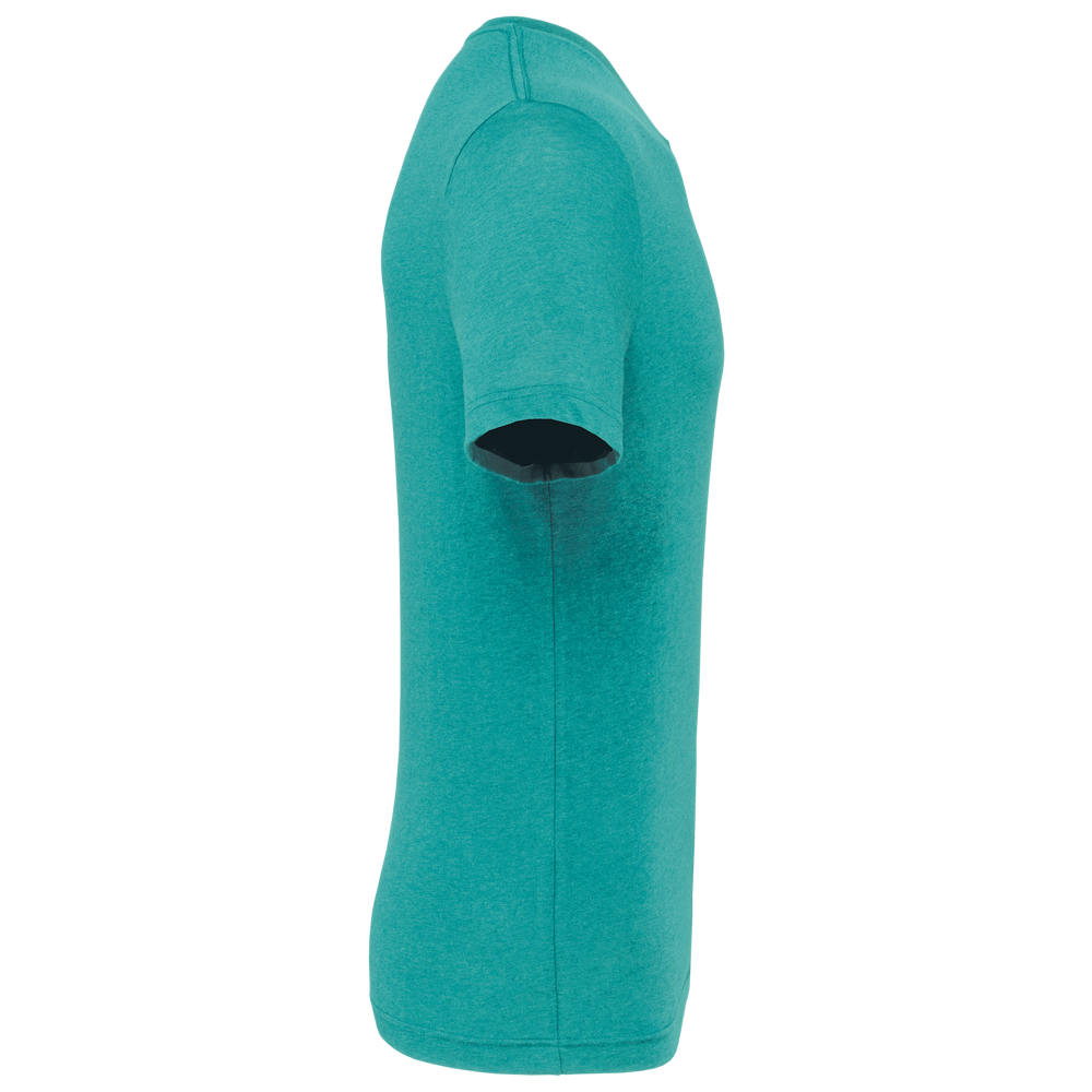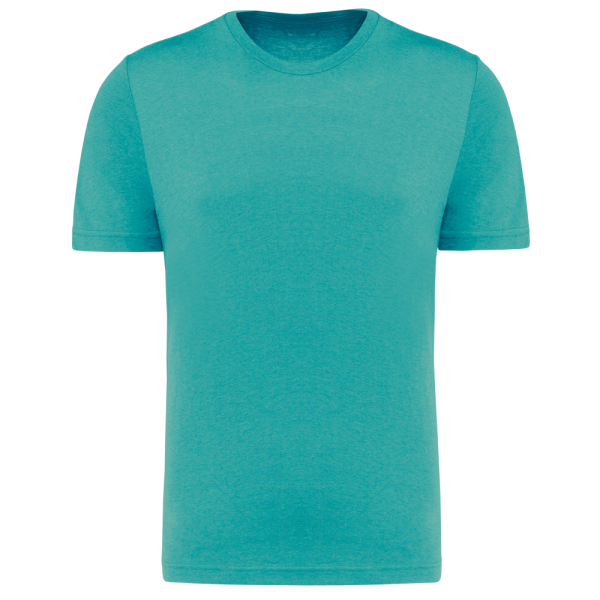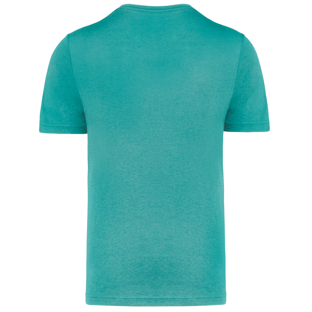 50% poliestere / 25% cotone / 25% viscosa. Tessuto jersey. Nastrino di rinforzo tono su tono sul collo. Finitura a doppia impuntura a fondo manica e fondo capo. Nessuna etichetta con il nome della marca al collo ma solo una piccola etichetta con l'indicazione della taglia per semplificare la personalizzazione.