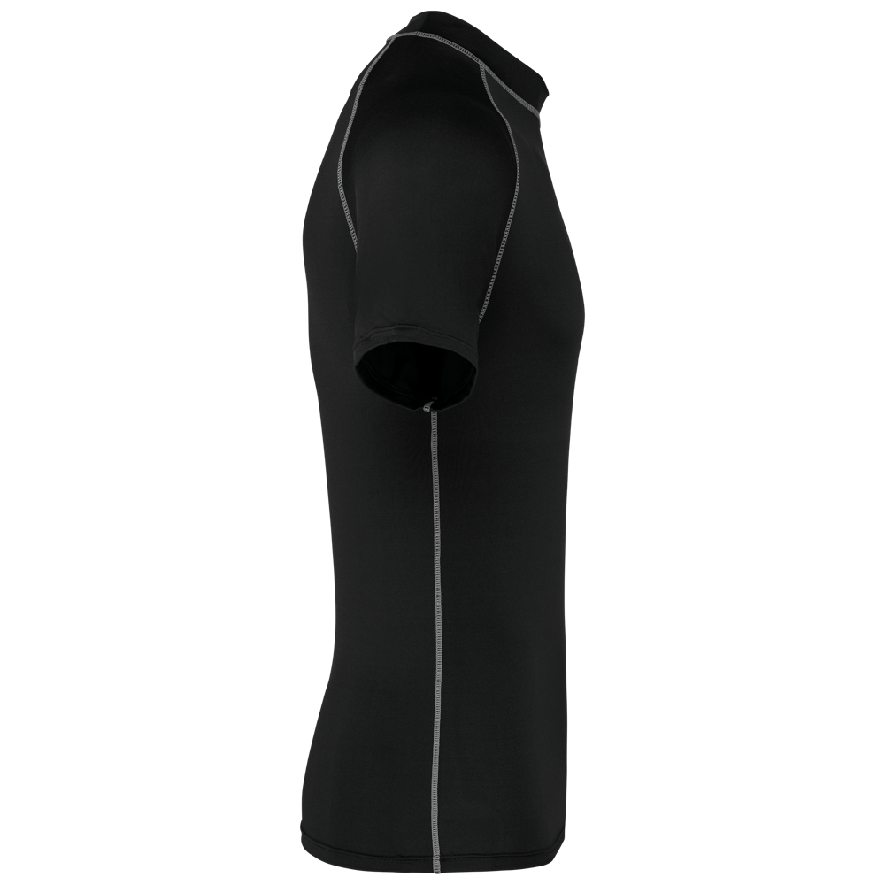 88% poliestere / 12% elastan. Maglia stretch. Protezione UV 40+ conforme ai requisiti della norma EN13758-1&2. Maniche corte. Collo alto. Taglio che segue perfettamente le forme del corpo. Occhiello elastico inserito nell'orlo anteriore per far passare la coulisse degli short e fissare la t-shirt. Sovracuciture a contrasto. Finitura a doppia impuntura a fondo manica e fondo capo.