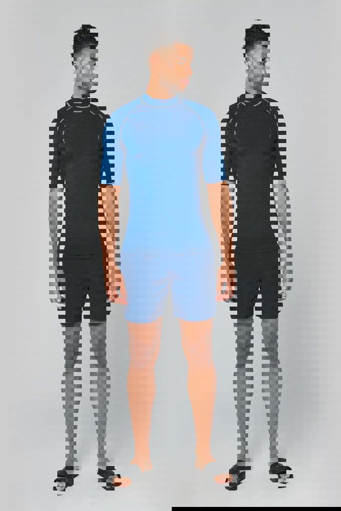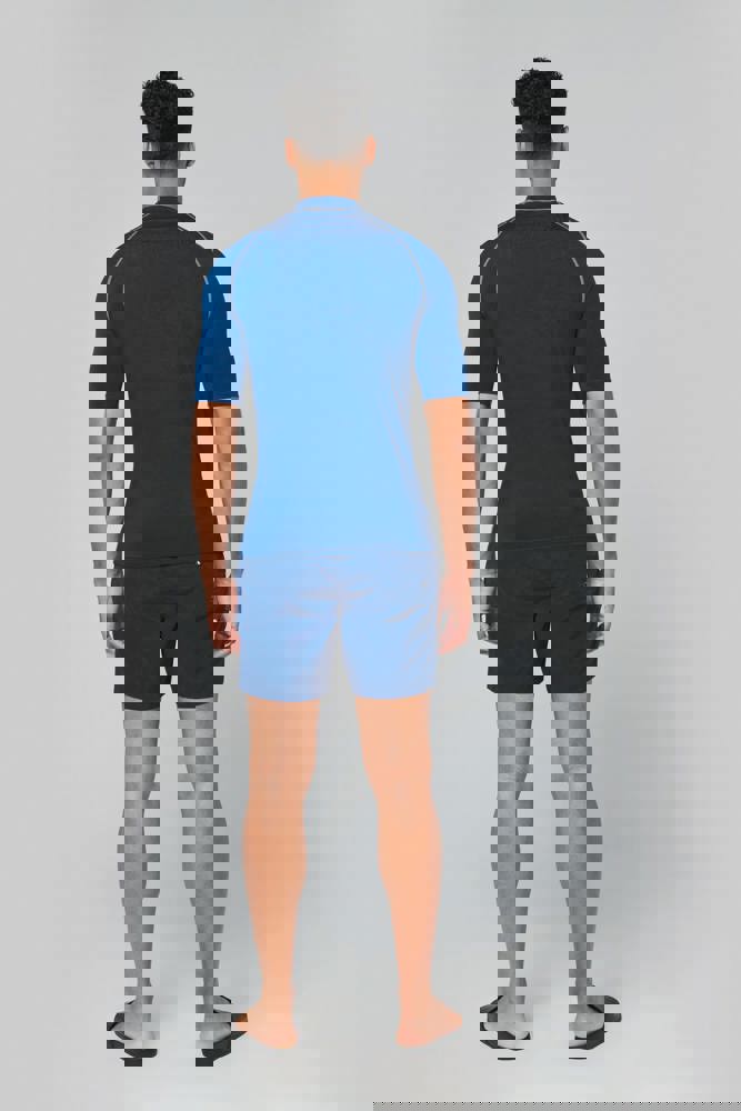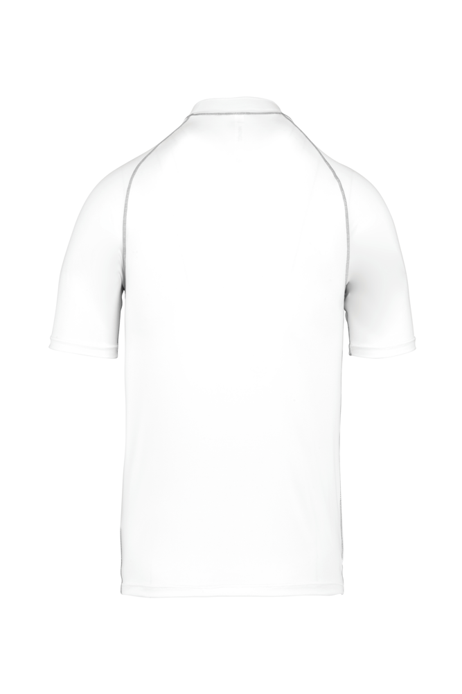 88% poliestere / 12% elastan. Maglia stretch. Protezione UV 40+ conforme ai requisiti della norma EN13758-1&2. Maniche corte. Collo alto. Taglio che segue perfettamente le forme del corpo. Occhiello elastico inserito nell'orlo anteriore per far passare la coulisse degli short e fissare la t-shirt. Sovracuciture a contrasto. Finitura a doppia impuntura a fondo manica e fondo capo.