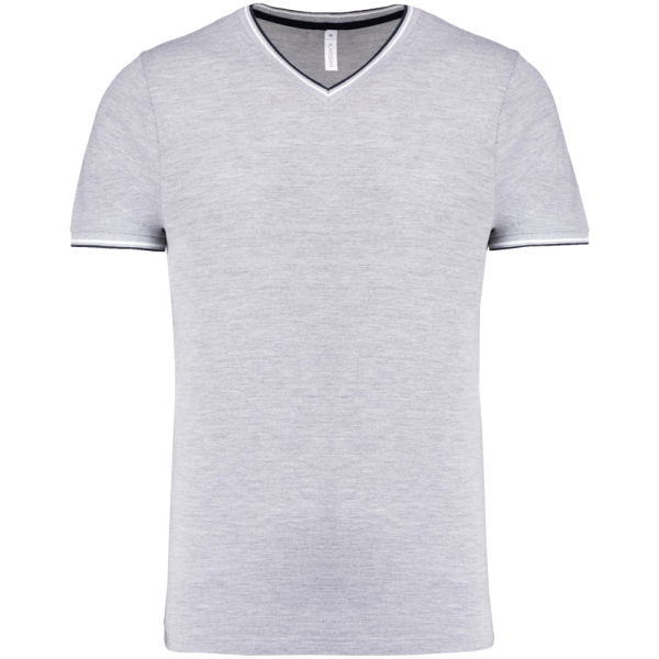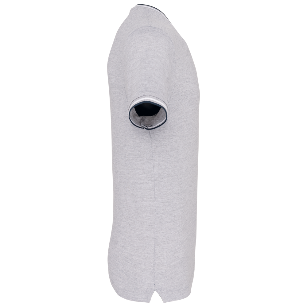 100% cotone pettinato piqué (Oxford Grey: 90% cotone / 10% viscosa). Collo e fondo manica a costine con righe a contrasto. Nastrino di rinforzo nel collo e spacchetti laterali a contrasto. Finitura a doppia impuntura a fondo capo.