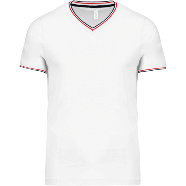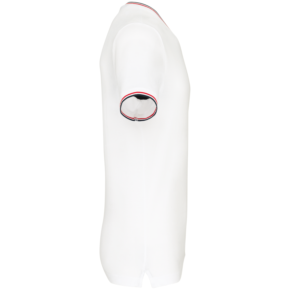 100% cotone pettinato piqué (Oxford Grey: 90% cotone / 10% viscosa). Collo e fondo manica a costine con righe a contrasto. Nastrino di rinforzo nel collo e spacchetti laterali a contrasto. Finitura a doppia impuntura a fondo capo.