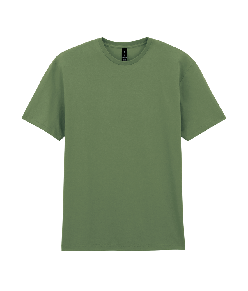 100% cotone (eccetto Graphite Heather: 50% cotone / 50% poliestere e Sport Grey: 90% cotone / 10% poliestere). 150 g/m². Colletto a costina. Nastro su collo e spalle per maggiore comfort e durata. Taglio classico.