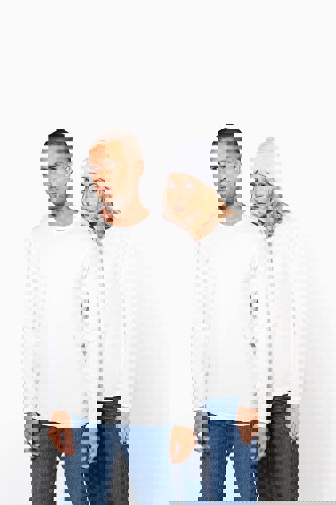 97% cotone / 3% elastan. Colori melange: 87% cotone / 9% viscosa / 4% elastan. Girocollo. Finitura a doppia impuntura a fondo manica e fondo capo. Con il suo taglio moderno e aderente, richiama i modelli del prêt à porter.