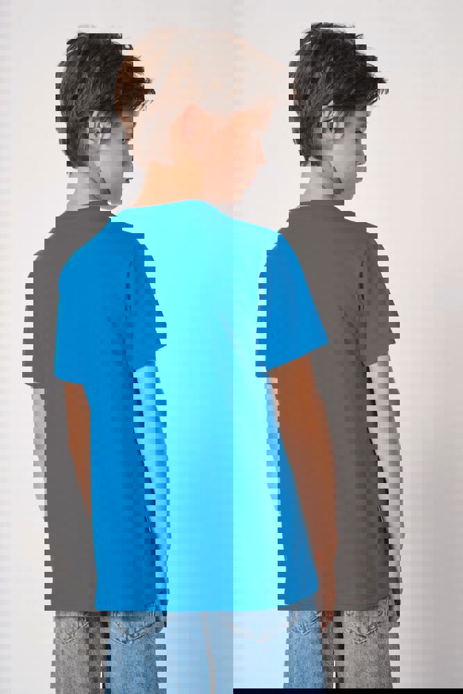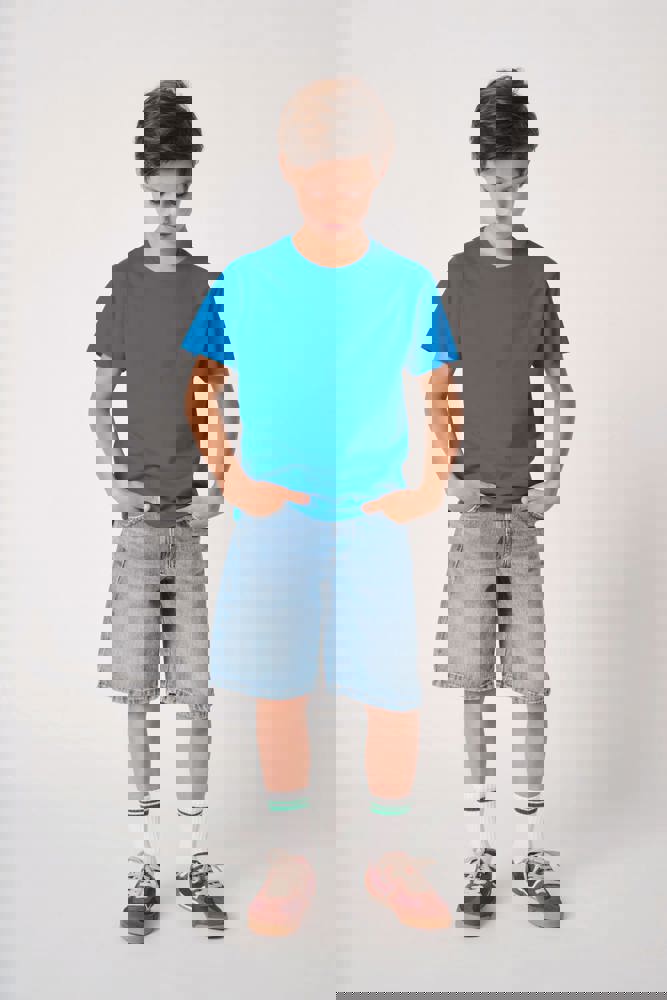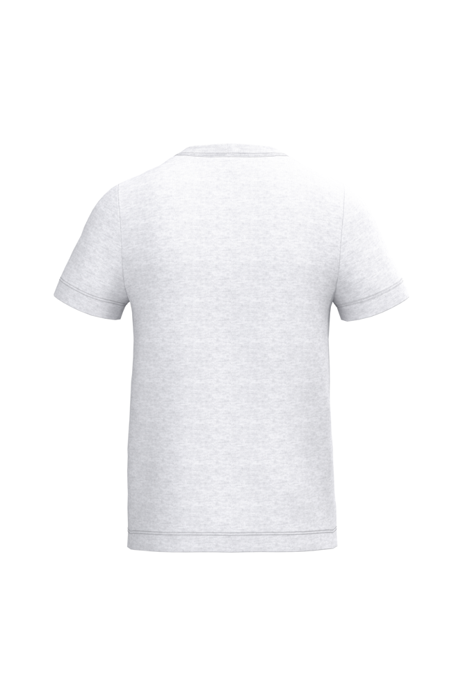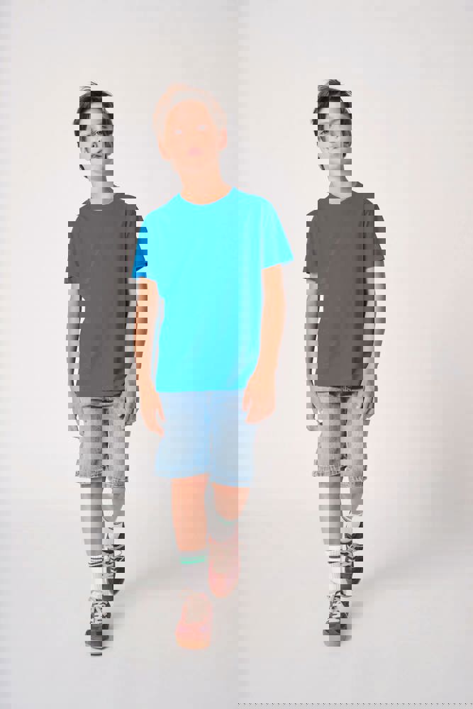 Colori uniti: 100% cotone. Colore Ideal Ash Heather: 99% cotone / 1% viscosa. Colore Ideal Oxford Grey: 90% cotone / 10% viscosa. Maglia jersey tagliata e cucita dalla taglia 1/2 alla 6/8 e tubolare dalla taglia 8/10 alla 12/14. Taglio dritto. Collo rotondo con finitura a costine 1x1 con doppie impunture. Nastro di rinforzo interno al collo tono su tono. Orli delle maniche e del fondo capo con finitura a doppio ago. Etichetta del marchio staccabile.