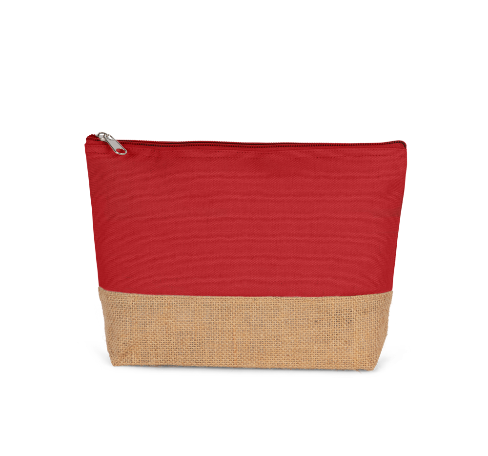 Pochette in tela di cotone con base a contrasto in iuta naturale laminata. Chiusura con zip. Può essere abbinata alla shopper KI0235.
