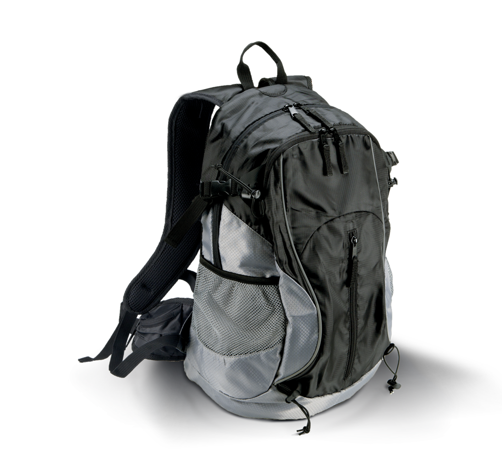 Zaino multiuso da cittá o outdoor, in Ripstop e Poliestere a nido d'ape. Tasca frontale con zip, 2 scompartimenti, tasche laterali in rete, elastici per aggangiare i bastoni da trekking, spallacci ergonomici regolabili, apertura per il tubo della borsa dell'acqua.
