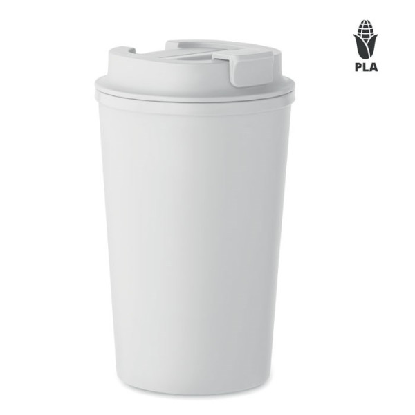 Double wall tumbler in 100% PLA corn with PP drinking lid with inner TPR. Leak free. Capacity: 350 ml.