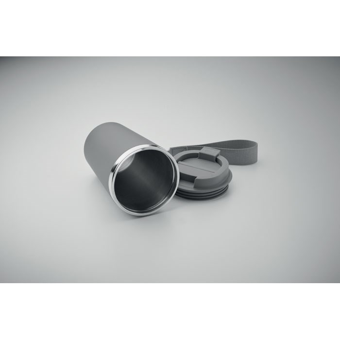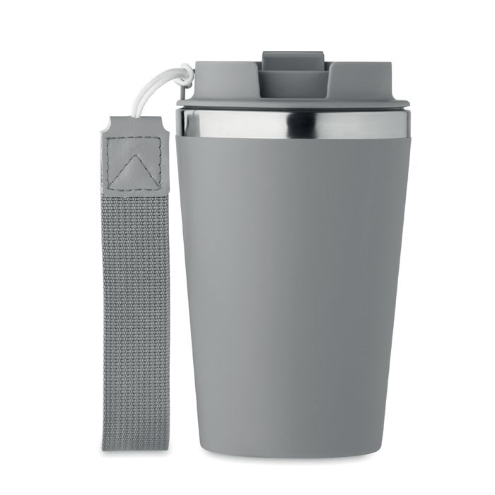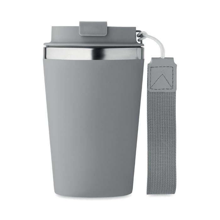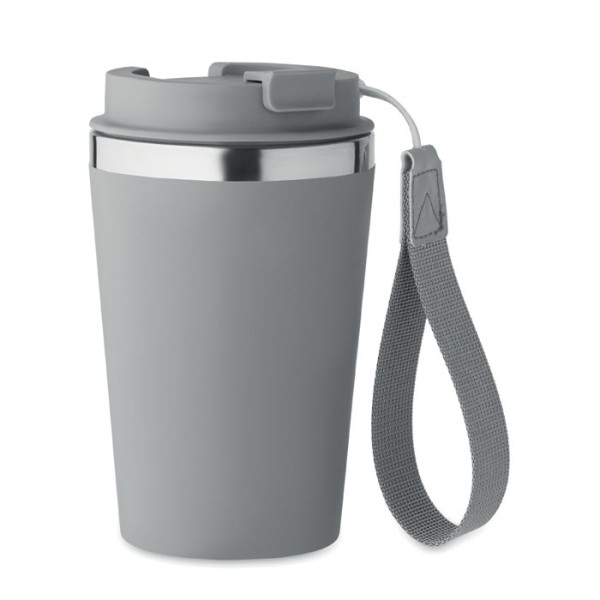 Double wall tumbler in recycled stainless steel (90% recycled stainless steel and 10% stainless steel) with PP outside layer with RPET wrist strap. Capacity: 350 ml.