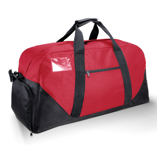 100% poliestere. Borsa sportiva o tempo libero in poliestere 600D. Tracolla sganciabile e regolabile, tasca laterale porta scarpe, tasca frontale con zip, porta badge trasparente, manici rinforzati, piedini in plastica.