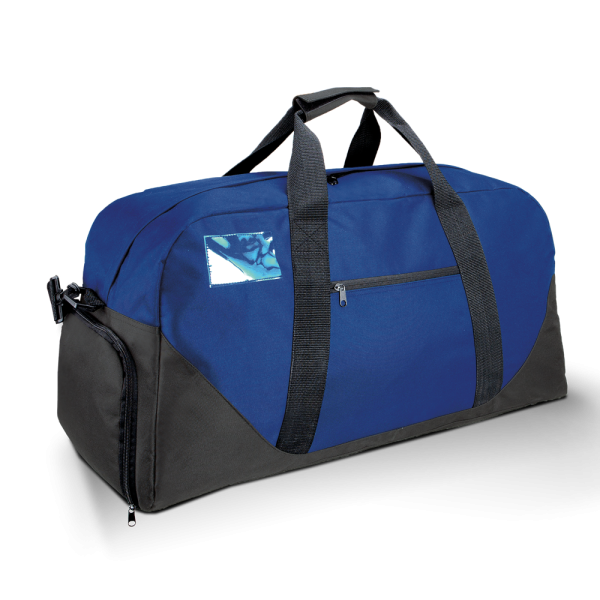 100% poliestere. Borsa sportiva o tempo libero in poliestere 600D. Tracolla sganciabile e regolabile, tasca laterale porta scarpe, tasca frontale con zip, porta badge trasparente, manici rinforzati, piedini in plastica.