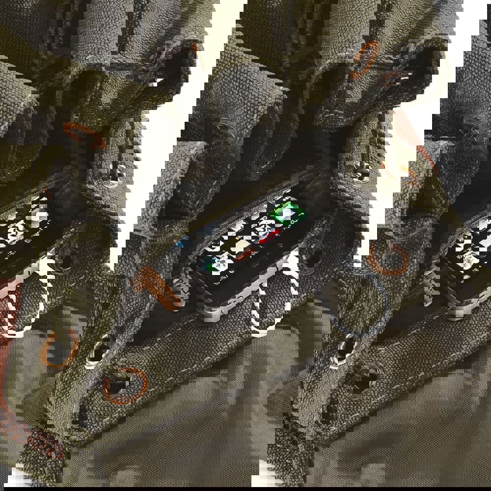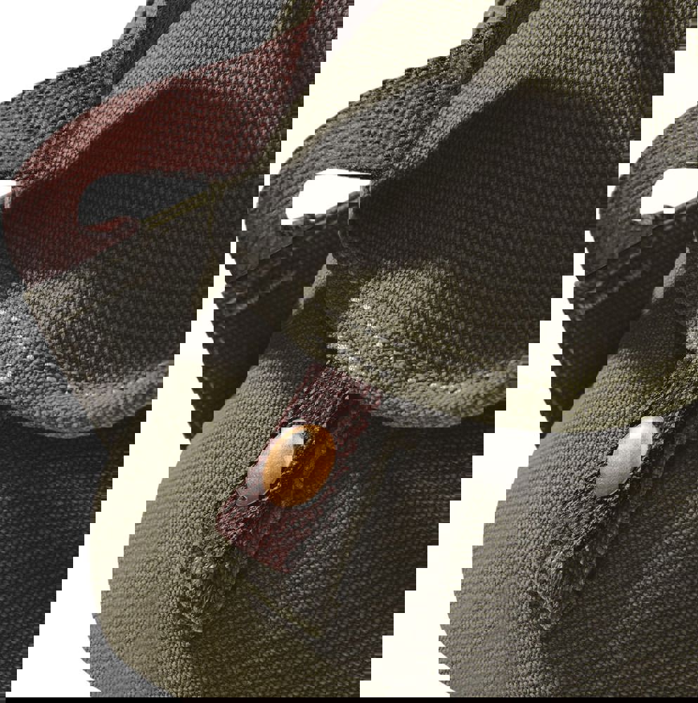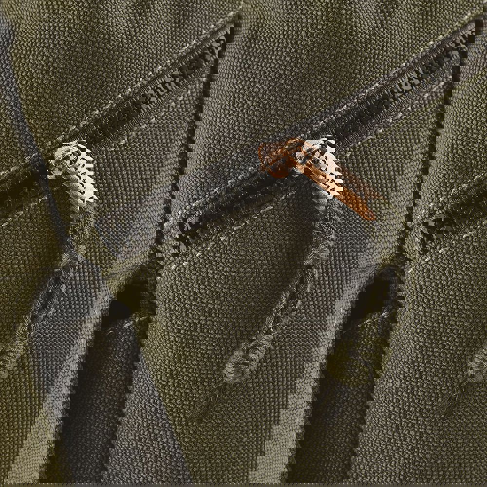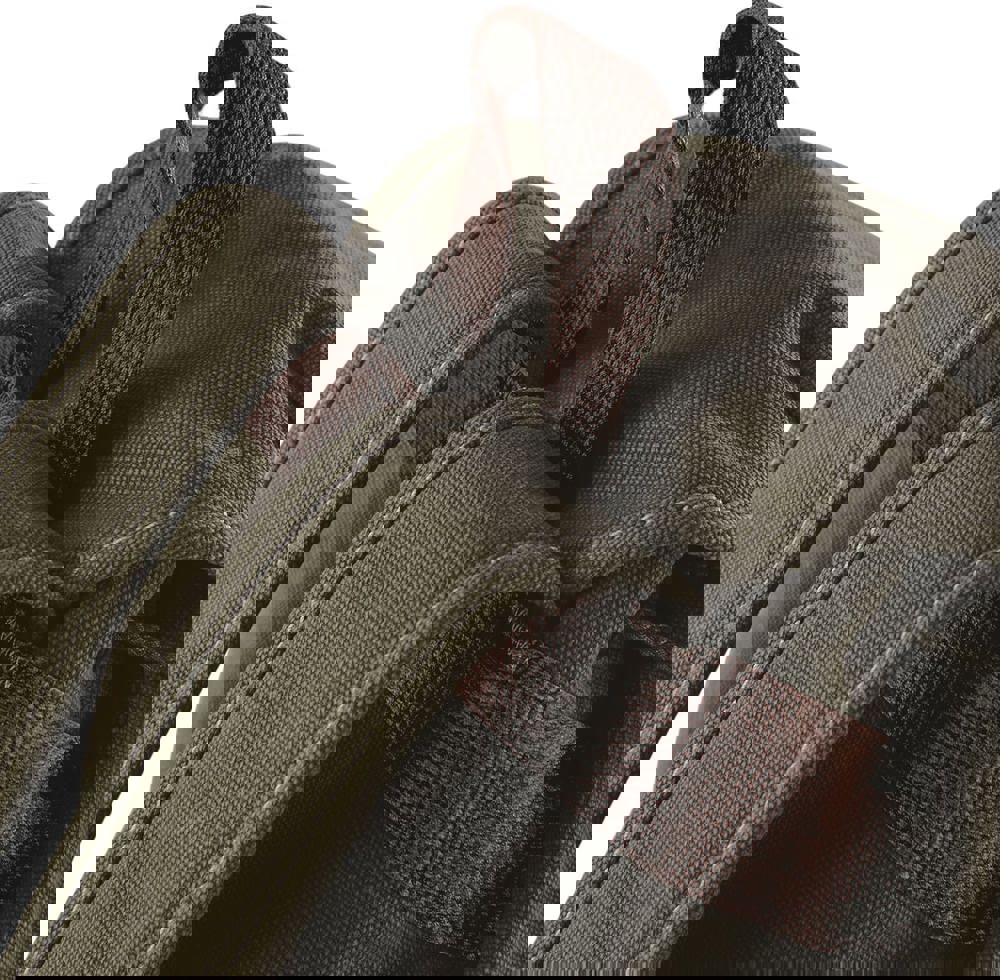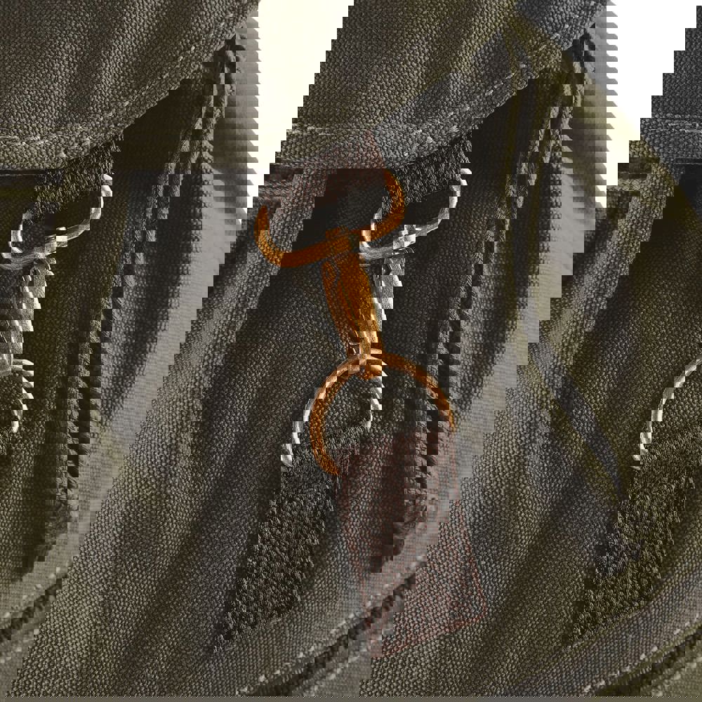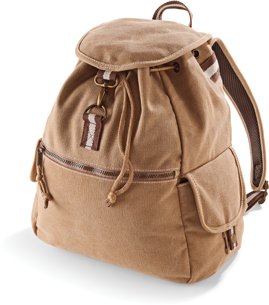 Canvas lavato. Minuterie in bronzo. Tasca frontale con zip. Tasca interna con zip. Tasche laterali. Base imbottita. Chiusura con cordino. Spalline imbottite e regolabili.