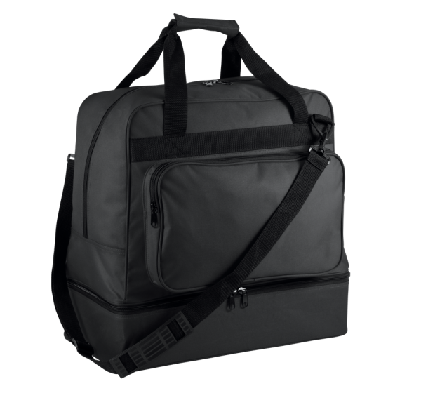 Borsa sport in poliestere 600D. 60 litri. Fondo rigido staccabile in polipropilene con piedini in plastica. Tasca frontale con zip per facilitare la personalizzazione, porta badge, tracolla staccabile con poggiaspalla in silicone. Fondo rigido in dotazione con la borsa.