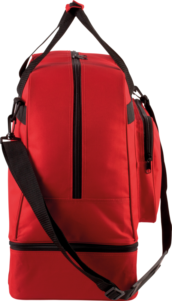Borsa sport in poliestere 600D. 60 litri. Fondo rigido staccabile in polipropilene con piedini in plastica. Tasca frontale con zip per facilitare la personalizzazione, porta badge, tracolla staccabile con poggiaspalla in silicone. Fondo rigido in dotazione con la borsa.