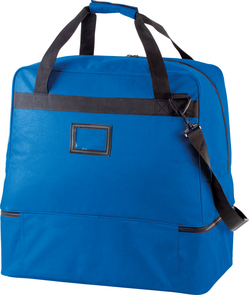 Borsa sport in poliestere 600D. 60 litri. Fondo rigido staccabile in polipropilene con piedini in plastica. Tasca frontale con zip per facilitare la personalizzazione, porta badge, tracolla staccabile con poggiaspalla in silicone. Fondo rigido in dotazione con la borsa.