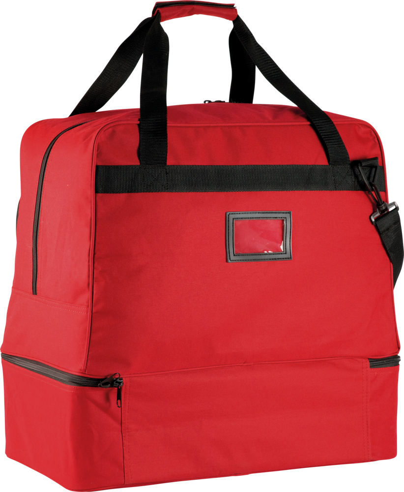 Borsa sport in poliestere 600D. 90 litri. Fondo rigido staccabile in polipropilene con piedini in plastica. Tasca frontale con zip per facilitare la personalizzazione, porta badge, tracolla staccabile con poggiaspalla in silicone. Fondo rigido in dotazione con la borsa.