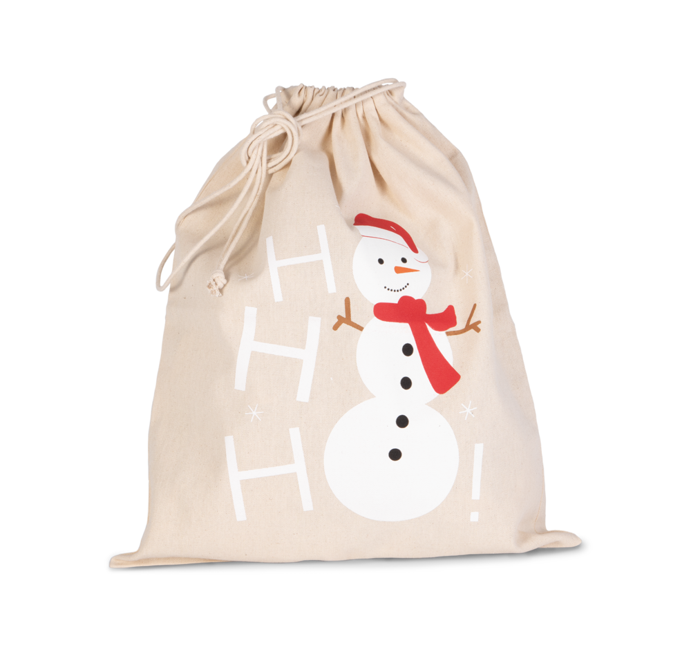 100% cotone. Borsa con chiusura a cordoncino, stampa con motivo "Pupazzo di neve". 38x45 cm.