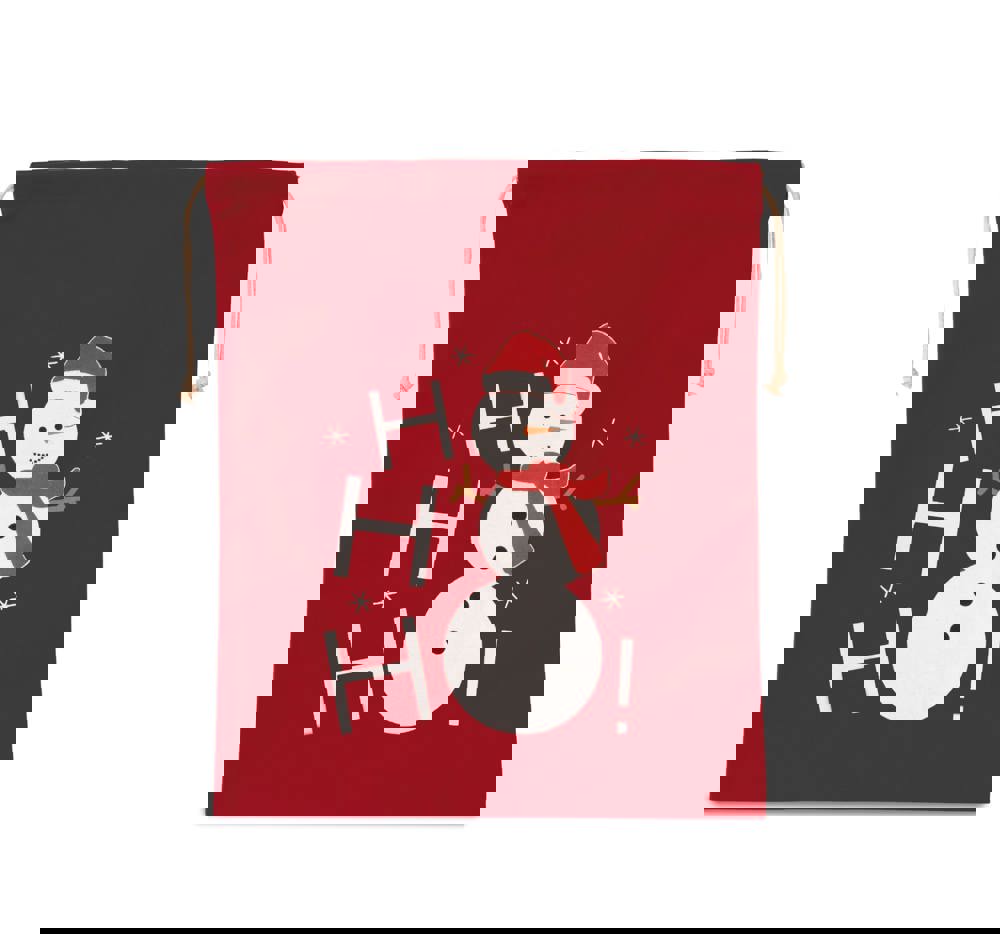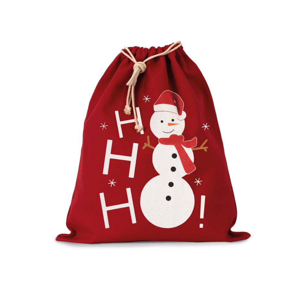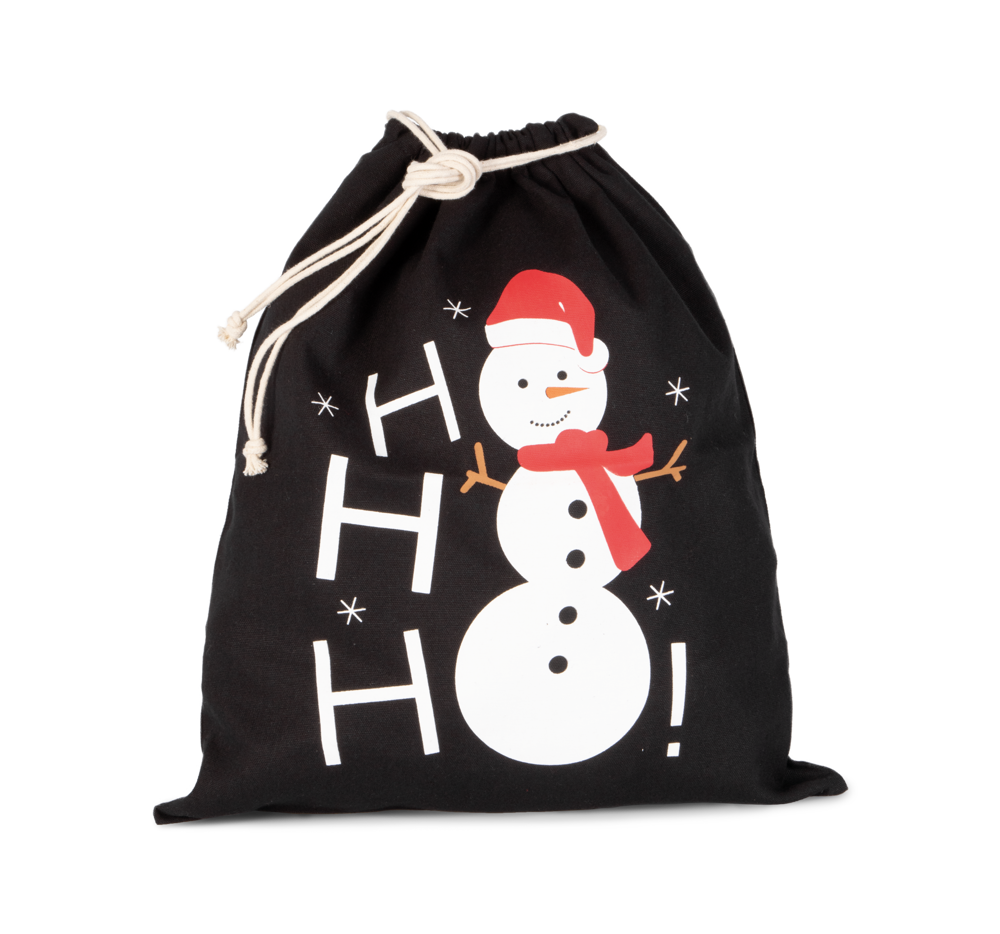100% cotone. Borsa con chiusura a cordoncino, stampa con motivo "Pupazzo di neve". 38x45 cm.