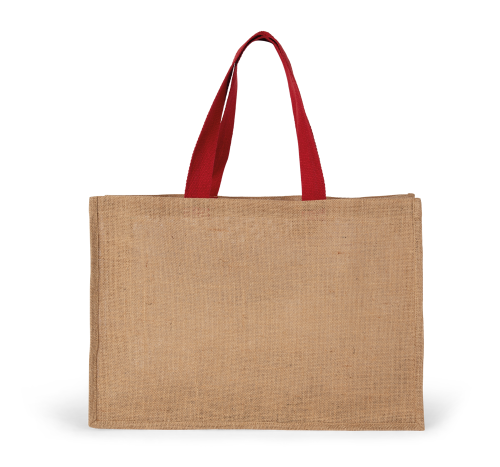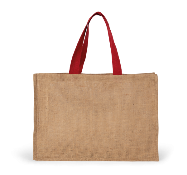 100% iuta. Borsa XL con manici in colore a contrasto. La stiratura con amido vegetale rende più rigida la juta e, quindi, la borsa che mantiene così la forma.
