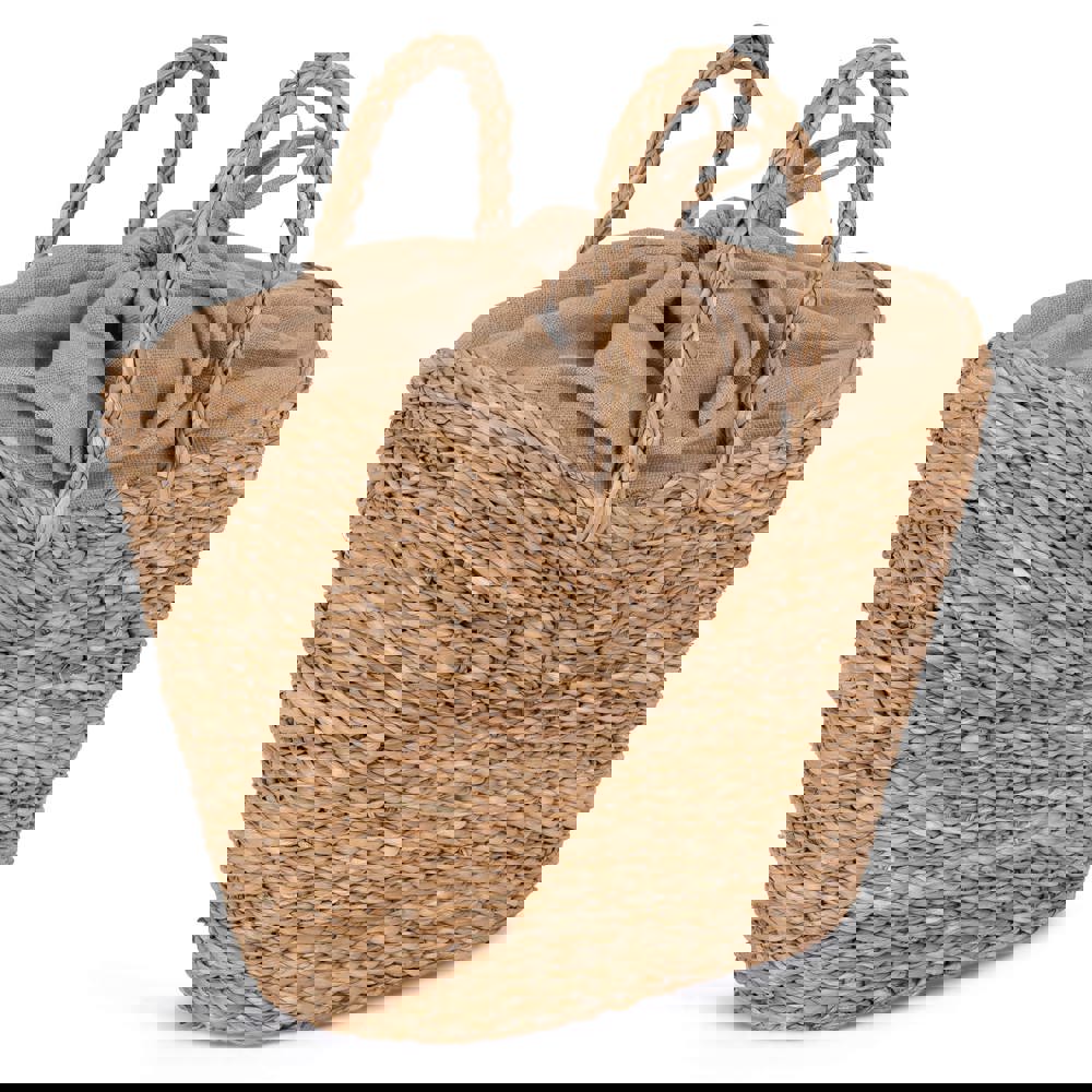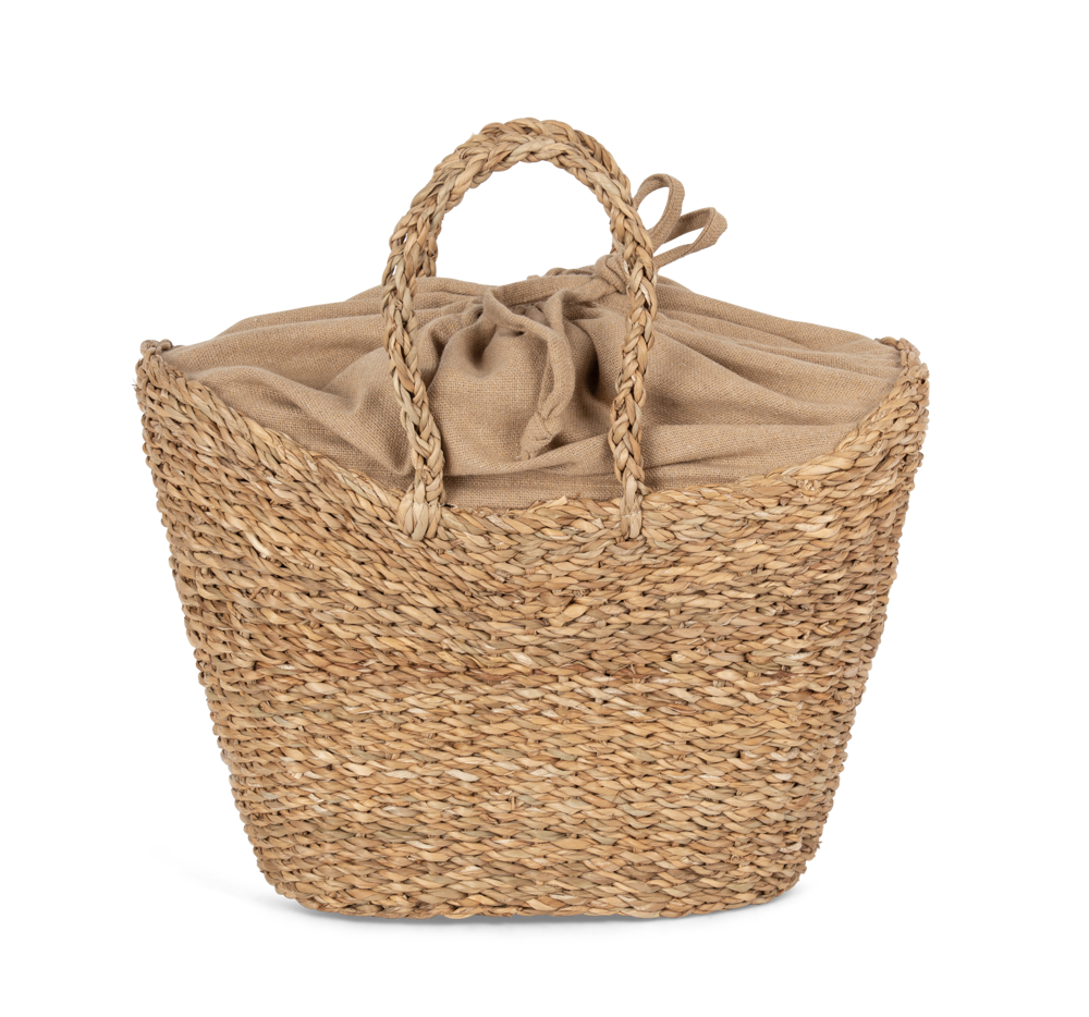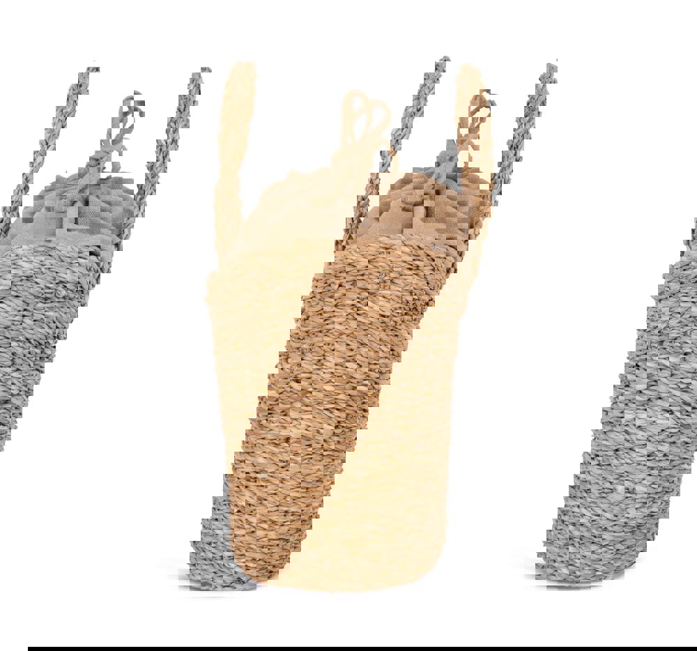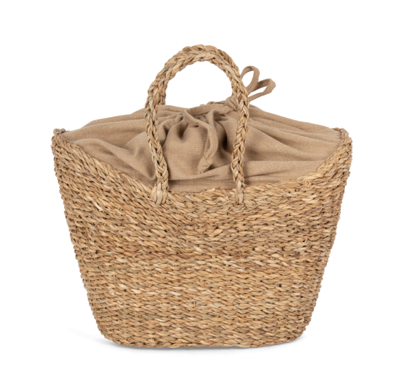 100 % giunco marino. ONE SIZE (21 x 38 x 21cm). Capienza: 19 L. Questo prodotto è intrecciato a mano a partire da fibre vegetali di giunco marino. Fodera interna colore Canapa in filo ciclo continuo realizzata a partire da 70% Cotone riciclato, 28% Poliestere riciclato e 2% altri materiali. Chiusura con coulisse. Manici ad intreccio rotondo. Questo cesto è il frutto di una collaborazione con la società HandTouch, membro di ECOTA: organizzazione per il commercio equo in Bangladesh che contribuisce ad un’economia più sostenibile.