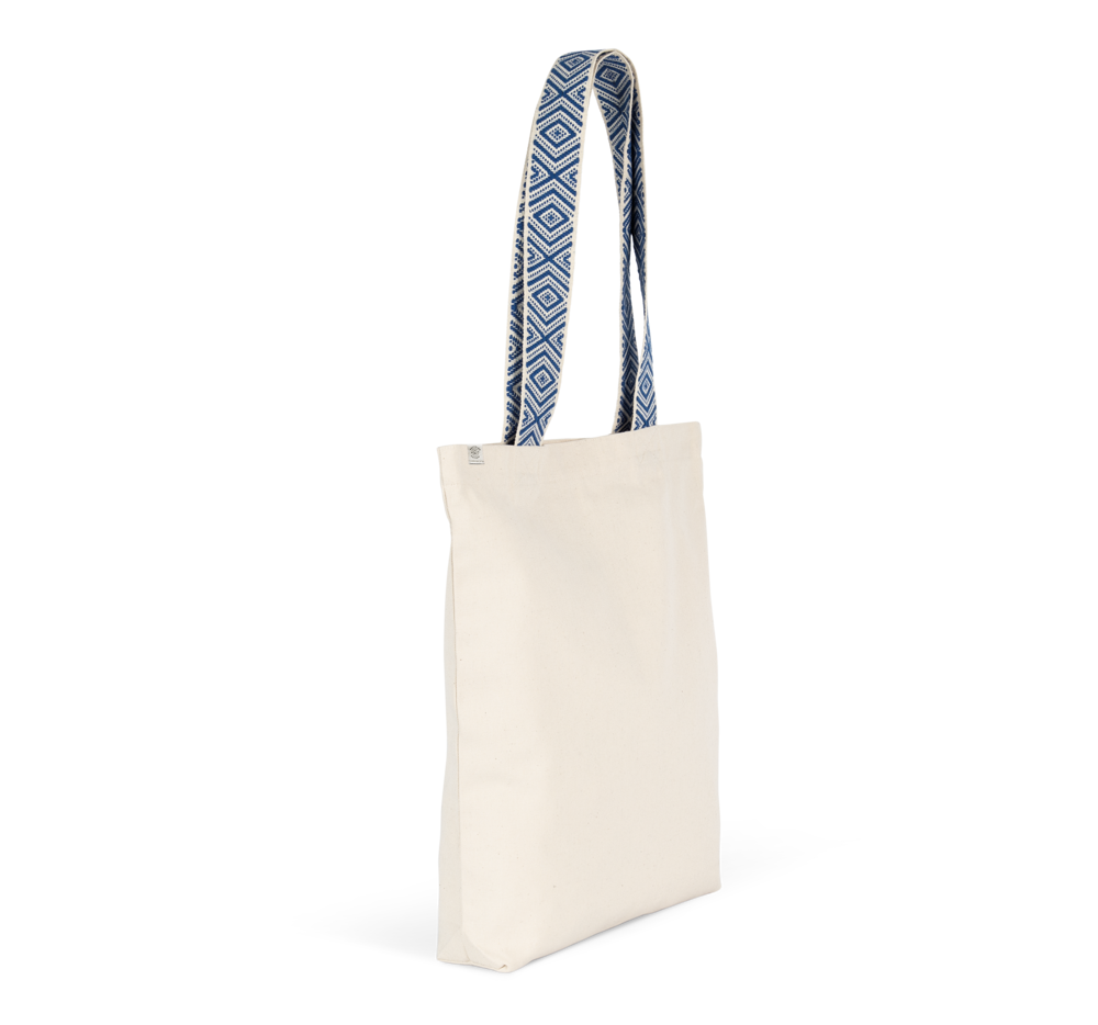 75% cotone riciclato / 22% poliestere riciclato / 3% altre fibre. I manici in colori a contrasto presentano una grafica di ispirazione etnica e misurano cm 60 in lunghezza e cm 4,25 in larghezza.