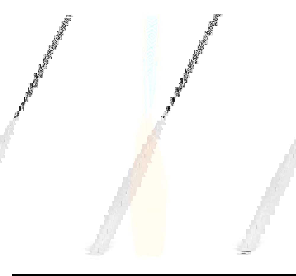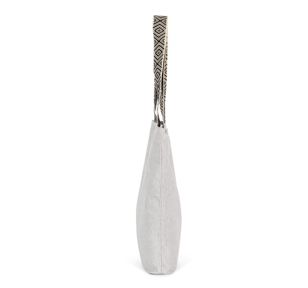 75% cotone riciclato / 22% poliestere riciclato / 3% altre fibre. I manici in colori a contrasto presentano una grafica di ispirazione etnica e misurano cm 60 in lunghezza e cm 4,25 in larghezza.