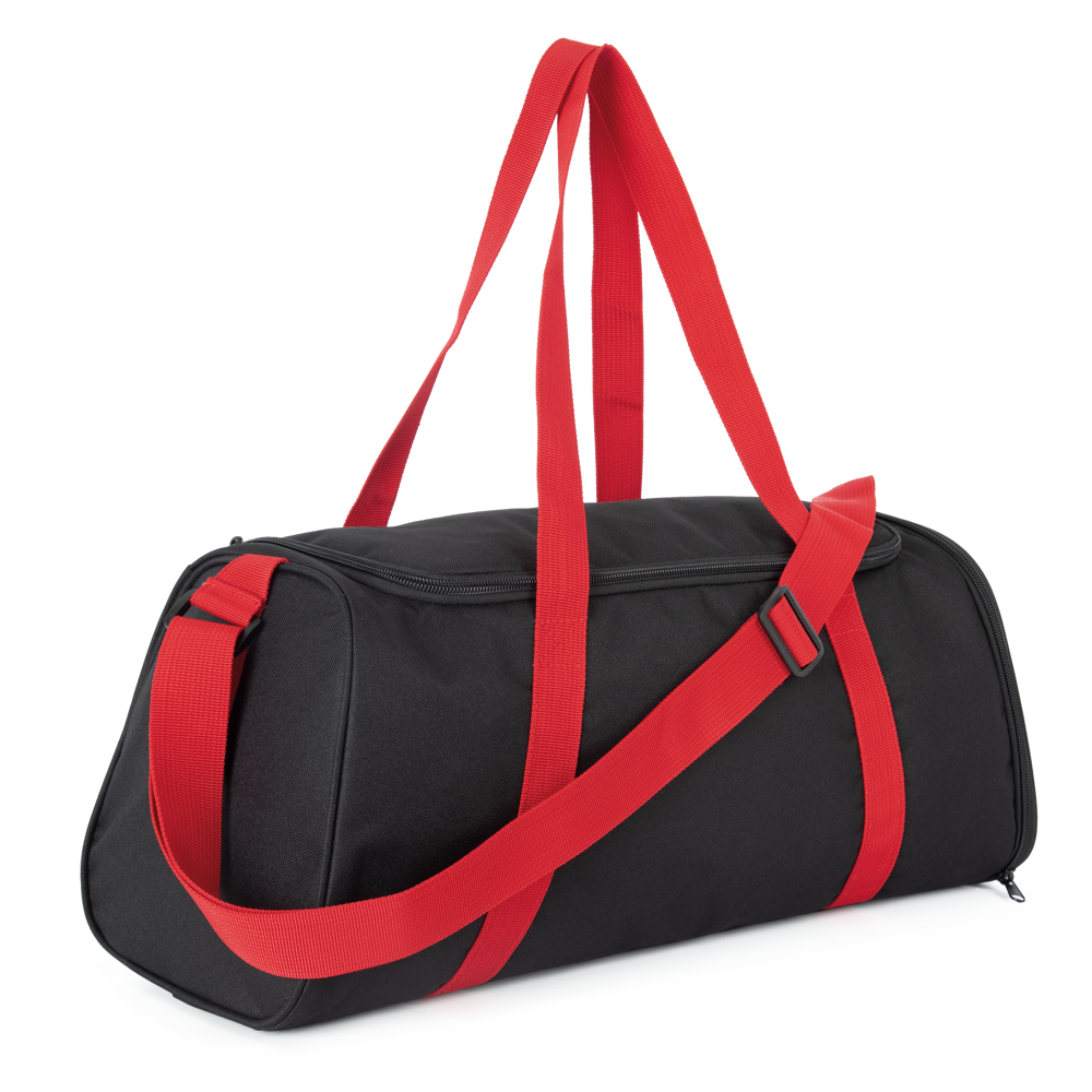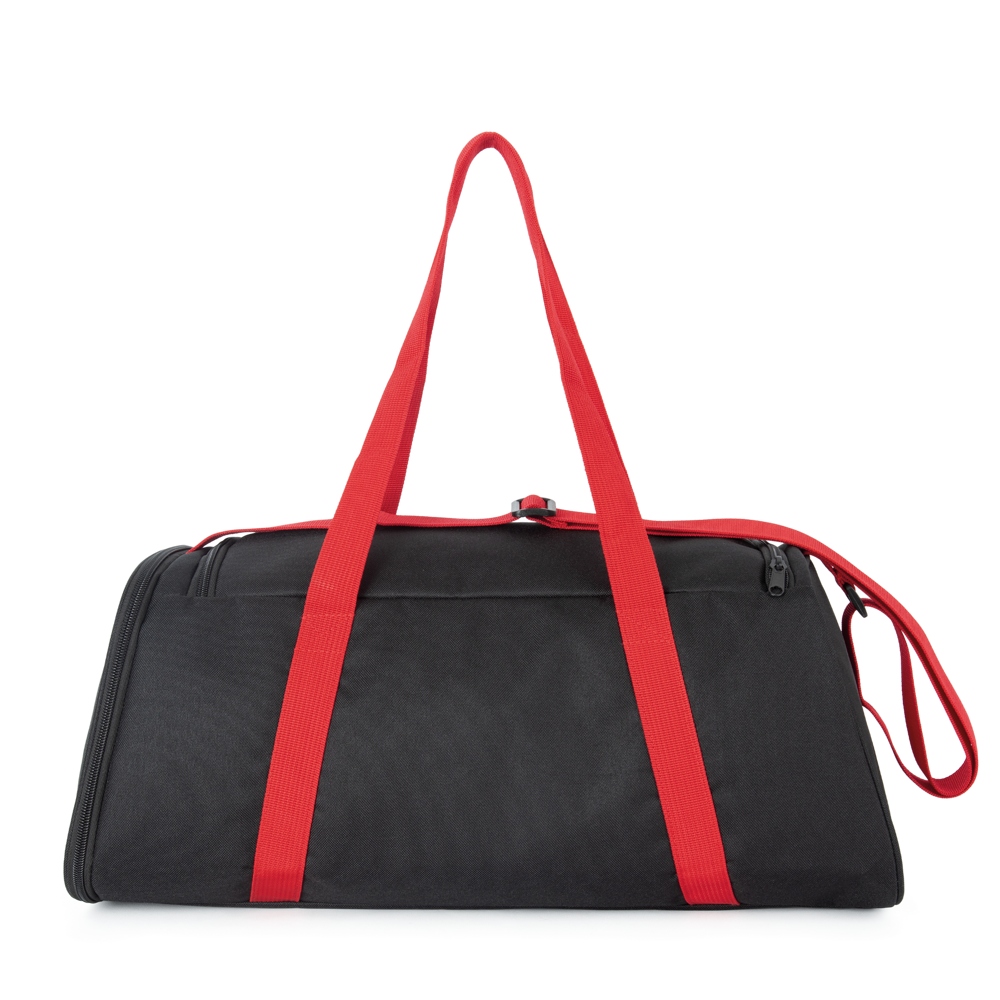 100% poliestere. Borsa sportiva con ampia apertura superiore e chiusura lampo bidirezionale. Tasca laterale con cerniera e sacca interna per le scarpe. Manici a nastro cuciti sul corpo della borsa. Tracolla regolabile.