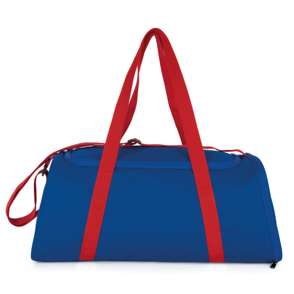 100% poliestere. Borsa sportiva con ampia apertura superiore e chiusura lampo bidirezionale. Tasca laterale con cerniera e sacca interna per le scarpe. Manici a nastro cuciti sul corpo della borsa. Tracolla regolabile.