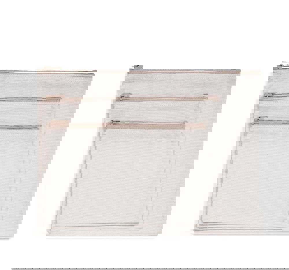 Ecume e Pebble Grey 75% cotone riciclato / 22% poliestere riciclato / 3 % altre fibre. Pochette piatta con zip.