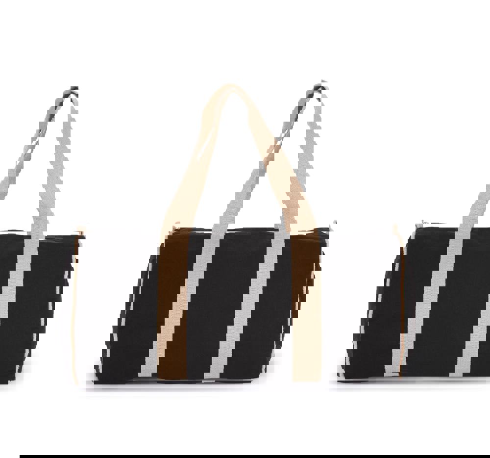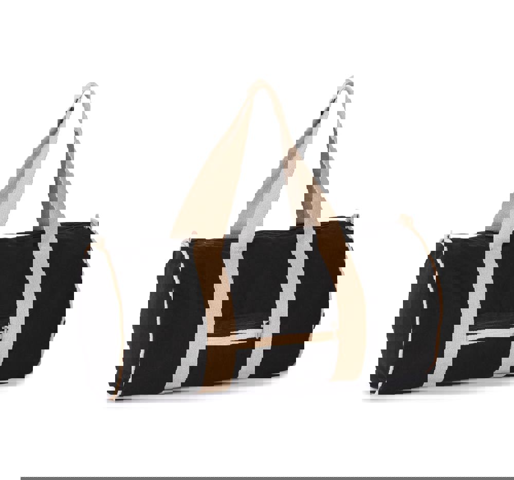 Black night 67% cotone riciclato / 30% poliestere riciclato / 3 % altre fibre. Ecume 75% cotone riciclato / 22% poliester riciclato / 3 % altre fibre. I manici, larghi 4,25 cm, ultra confortevoli e in colore a contrasto, sono cuciti tutt'intorno al borsone per apportare un tocco di originalità ed una maggiore resistenza. Il borsone è dotato di tasca frontale con zip.