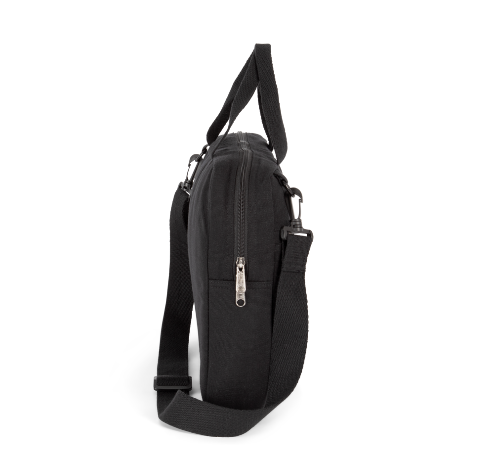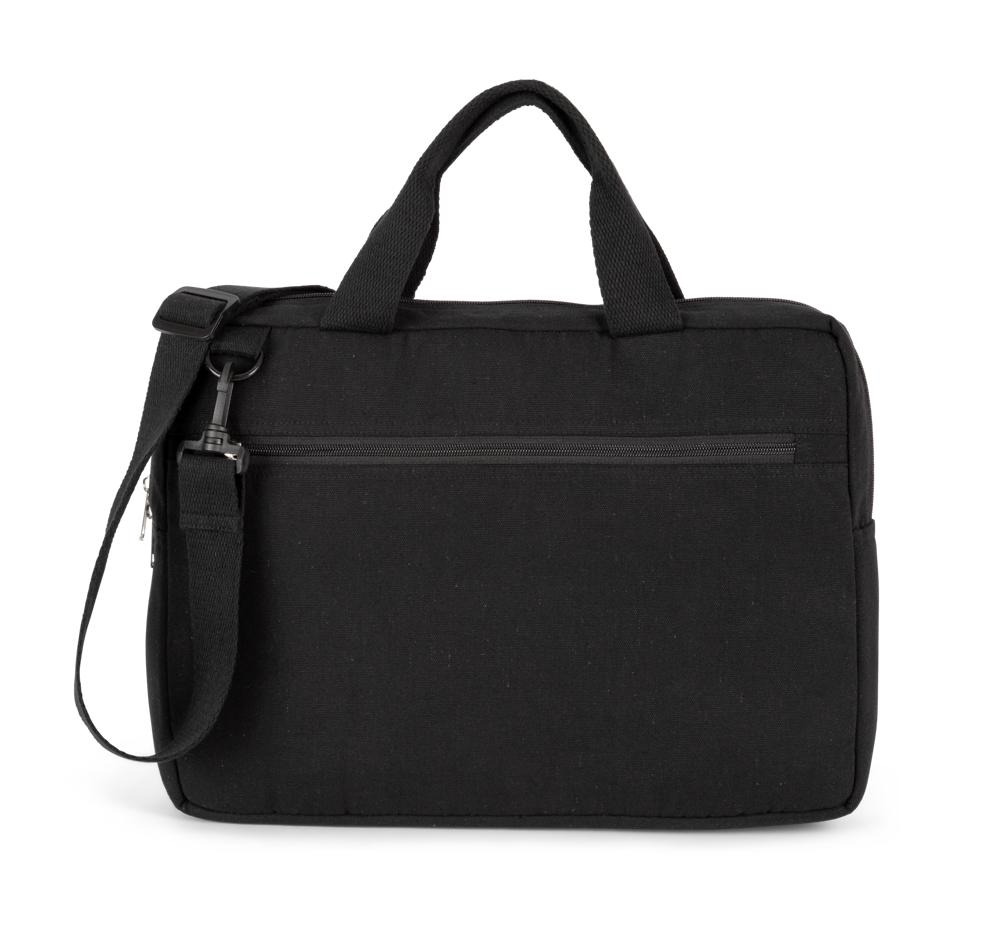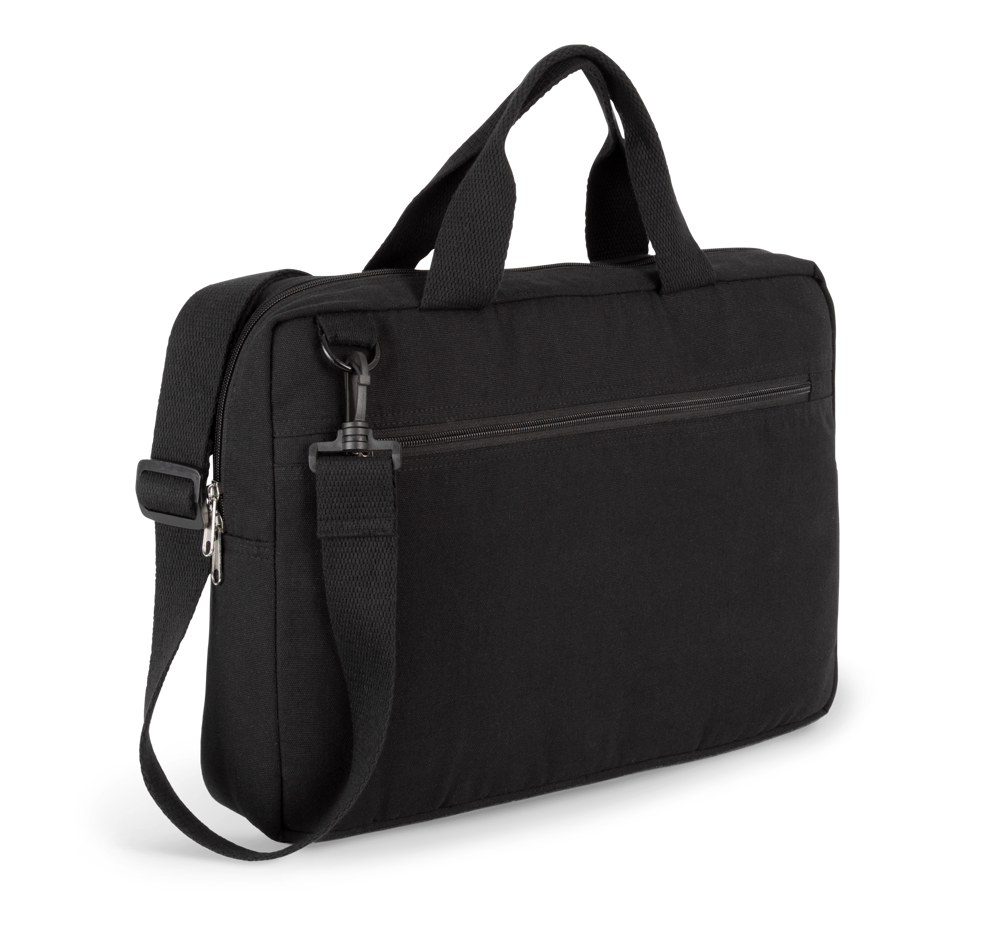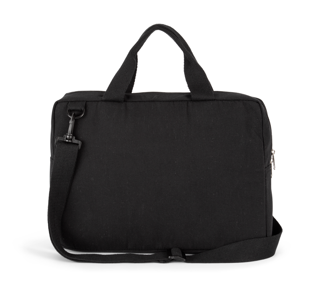 Cotone riciclato / poliestere riciclato. Borsa da lavoro porta-computer (15 inch) e porta-documenti. Manici + tracolla regolabile e staccabile in nastro di cotone riciclato. Questa borsa fa parte del progetto "K-loop". Grazie a questo progetto, Kimood chiude il ciclo dell'economia circolare nel senso letterale del termine. Il cotone utilizzato proviene, infatti, dagli scarti di lavorazione degli articoli in cotone del marchio Kariban e della linea KARIBAN BRANDS. Il poliestere aggiunto proviene dal riciclo di bottiglie di plastica in PET. Durante il processo di riciclo, al filato vengono applicati dei traccianti, ovvero filamenti in viscosa e ceramica che fungono da impronte digitali uniche. I traccianti riflettono la luce in modo unico e contengono, quindi, un codice univoco e inviolabile. Questo ci consente di memorizzare in una blockchain tutte le informazioni relative ai processi a cui il filo è stato sottoposto in modo univoco. Grazie alla tecnologia dei traccianti Aware™ e alla relativa piattaforma blockchain, Kimood consente al consumatore finale di seguire l'intero processo produttivo. Ciò garantisce che il prodotto sia stato riciclato utilizzando i suoi stessi rifiuti, senza alcuna possibile alterazione del processo. Un'etichetta speciale, con un codice QR che consente l'accesso alla piattaforma Aware™ e l'autenticazione diretta delle certificazioni con un semplice smartphone.